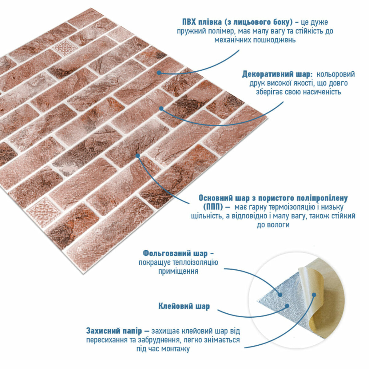 - Захисний папір – оберігає клейовий шар від пересихання та забруднення, легко знімається під час монтажу.