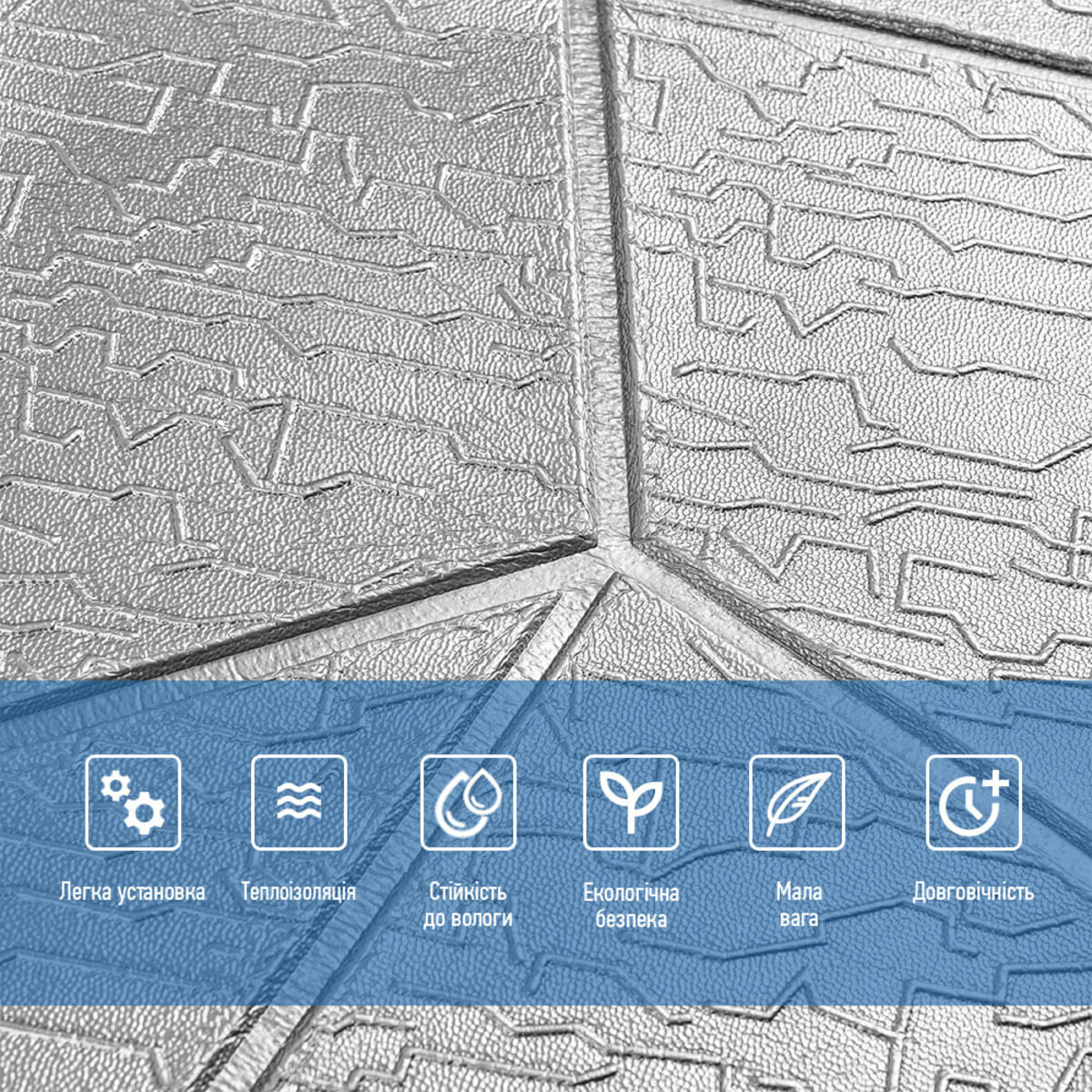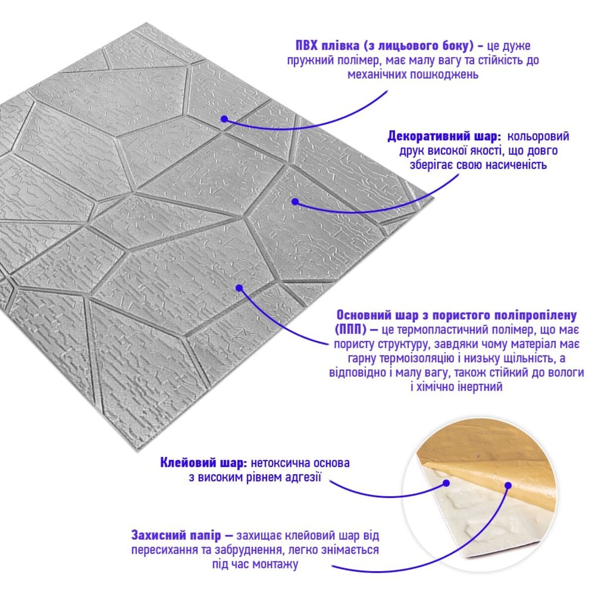 - Легкість монтажу: наявність клейового шару дозволяє встановити панелі без необхідності застосування додаткових матеріалів.