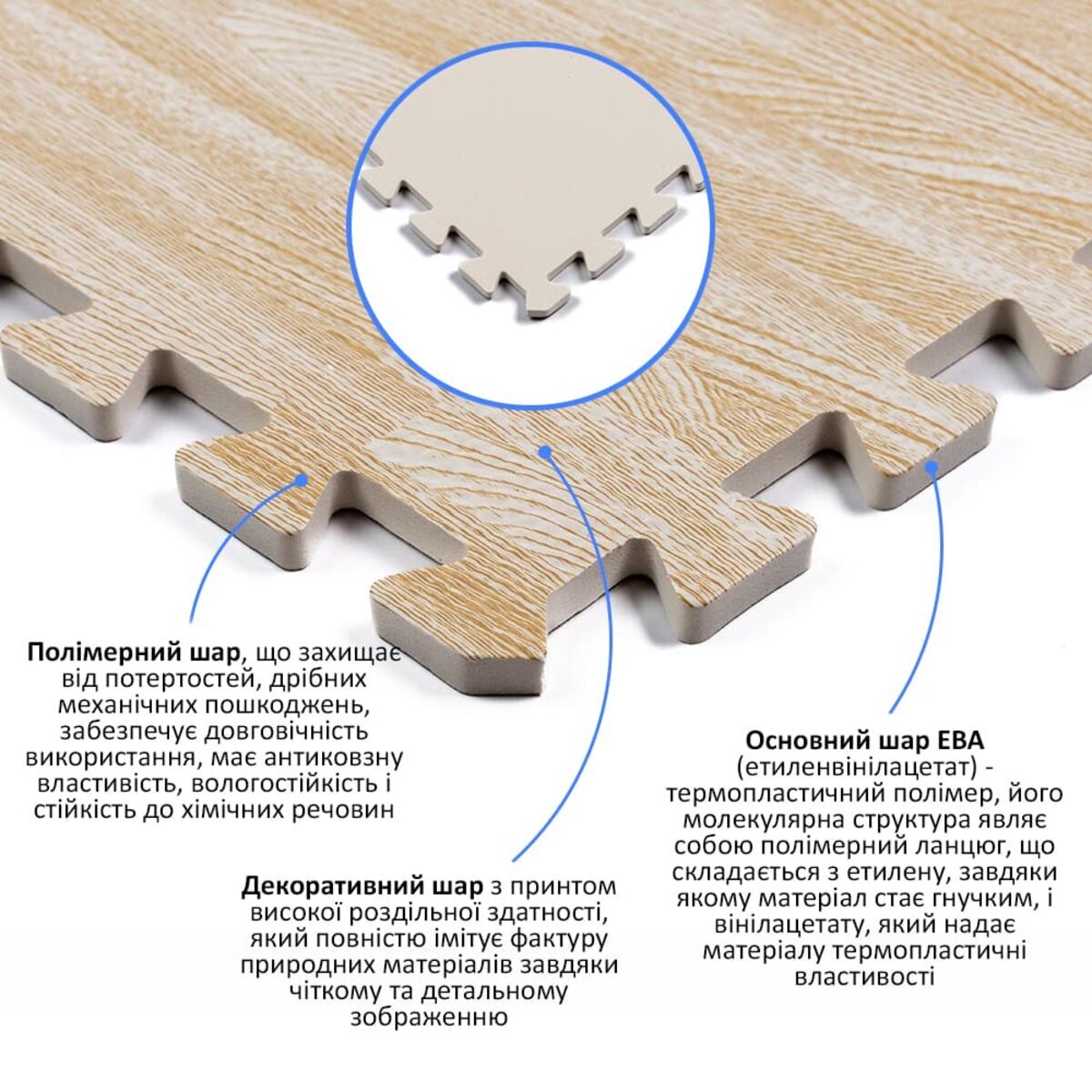 - Полімерний шар, що захищає від потертостей, дрібних механічних пошкоджень, забезпечує довговічність використання, має антиковзну властивість, вологостійкість і стійкість до хімічних речовин.