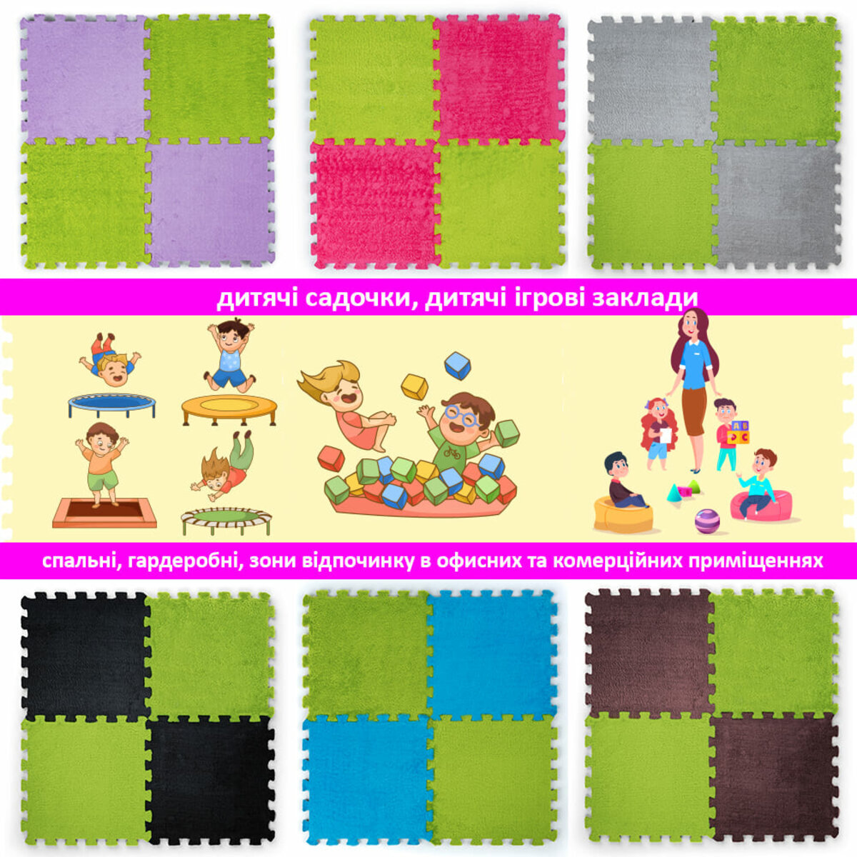 Застосування: Пазли плюшеві призначені для укладання підлогового покриття у житлових приміщеннях (вітальня, спальня або дитяча, кухня та санвузол) та у комерційних приміщеннях (дитячі садки, дитячі ігрові заклади, студії та гуртки, школи).