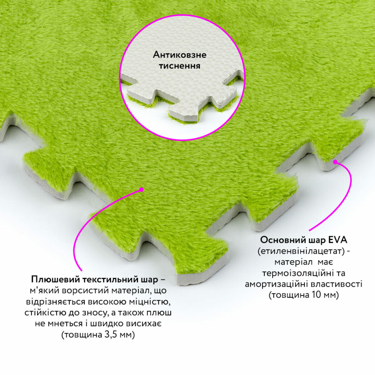 Товщина пазла: основний шар – 10 мм + ворс – 3,5 мм