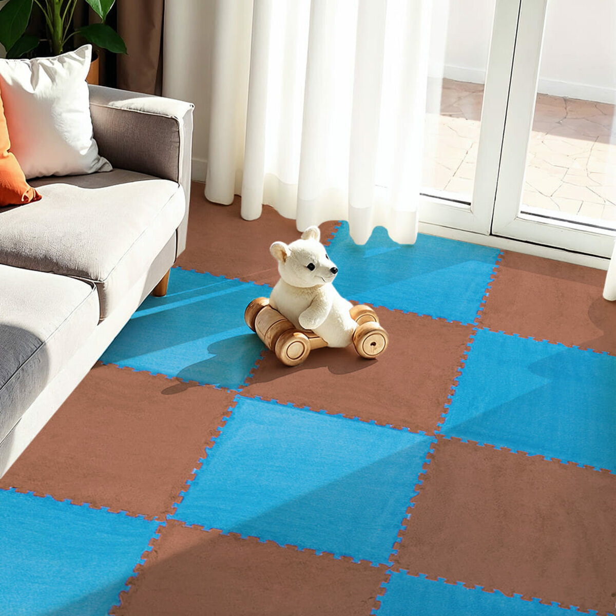 М'якість та пружність. Основний матеріал EVA має високу пружність і м'якість. Завдяки цьому навіть при стандартній товщині 10 мм покриття забезпечує високий рівень амортизаційних властивостей, що допомагає пом'якшити удари. Це особливо важливо для підлоги в дитячих кімнатах, спортивних залах та інших приміщеннях, де безпека та комфорт мають значення. Верхній шар виготовлений з м'якого ворсистого матеріалу, який створює приємні тактильні відчуття та забезпечує комфорт при ходьбі босоніж, що робить його ідеальним вибором для використання в холодних приміщеннях. Теплоізоляційні властивості. Комбінування плюшу та EVA ефективно утримує тепло, що робить пазли чудовим вибором для підлогового покриття в приміщеннях, де важливо зберігати комфортну температуру. Ця властивість також сприяє енергозбереженню, знижуючи витрати на опалення. Звукоізоляція. Завдяки густому ворсу та основному матеріалу, пазли мають високі звукоізоляційні властивості. Це допомагає знизити рівень шуму в приміщенні, створюючи тихішу та спокійнішу атмосферу. Антистатичні властивості: Матеріал EVA має в своєму складі антистатичні добавки, тому покриття не проводить струм та не електризується. Естетичність. Пазли плюшеві відрізняються привабливим зовнішнім виглядом завдяки м'якому ворсу і різноманітності кольорів. Це дозволяє використовувати пазли плюшеві не тільки для практичних цілей, але й як елемент декору, що додає затишку та стилю інтер'єру. Різні варіанти стикування дозволяють легко комбінувати різні кольори, створюючи унікальні та оригінальні композиції. Стійкість до механічних впливів та еластичність. Матеріал EVA, який використовується в плюшевих пазлах, більш щільний, ніж бюджетні аналоги. Він має високу стійкість до механічних впливів та еластичність. Особливість матеріалів EVA і плюшу полягає у здатності швидко відновлюватися у вихідну форму після перестановки великогабаритних меблів, не залишаючи слідів від ніжок столів, стільців та інших легких меблів або предметів інтер'єру. Антиковзні властивості. На зворотному боці плюшевих пазлів є спеціальне тиснення, що забезпечує надійну фіксацію на підлозі і запобігає ковзанню під час використання. Простота монтажу. Пазли легко складаються завдяки замкам, які забезпечують надійне з'єднання між окремими елементами. Це дозволяє швидко створювати підлогове покриття будь-якої форми та розміру, без необхідності використання додаткових інструментів або спеціальних навичок. Монтаж пазлів можна виконати самостійно, без спеціальних інструментів, а при необхідності їх легко можна різати ножицями або монтажним ножем. Легкість у догляді. Пазли дуже прості в обслуговуванні: їх можна легко мити водою з милом, що спрощує підтримання чистоти. Після миття вони швидко сохнуть, що робить їх ідеальними для регулярного використання. Швидка реновація: при потребі можна легко змінити окремий пазл без необхідності замінювати все покриття. Розрахунок потрібної кількості матеріалу: