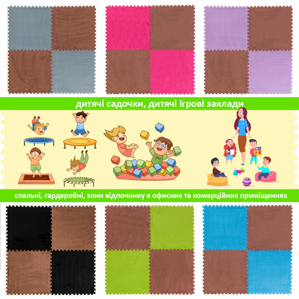 Застосування: Пазли плюшеві призначені для укладання підлогового покриття у житлових приміщеннях (вітальня, спальня або дитяча, кухня та санвузол) та у комерційних приміщеннях (дитячі садки, дитячі ігрові заклади, студії та гуртки, школи).