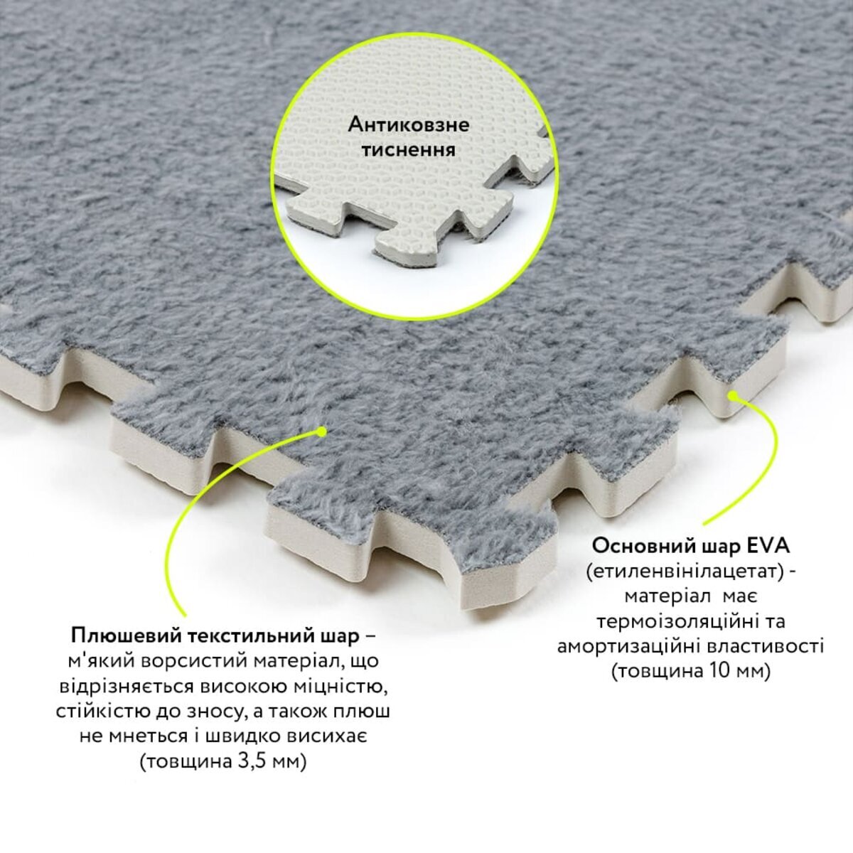 Товщина пазла: основний шар – 10 мм + ворс – 3,5 мм