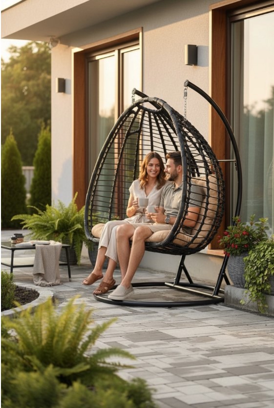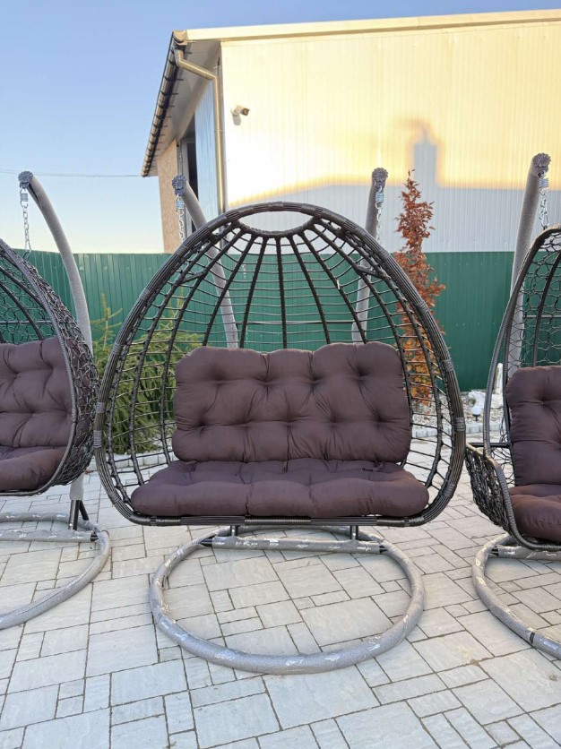 Підвісне двомісне крісло-кокон GARDEN-LINE — елегантне підвісне крісло від українського виробника Кайрос. Виготовлене з техноротангу з додатковим декоративним плетінням, на посиленому металевому каркасі. Глибока чаша-кокон, великі м’які подушки та надійна система підвісу забезпечують максимальний комфорт для двох. Навантаження до 200 кг, стійке до сонця та вологи — чудовий вибір для лаунж-зони.