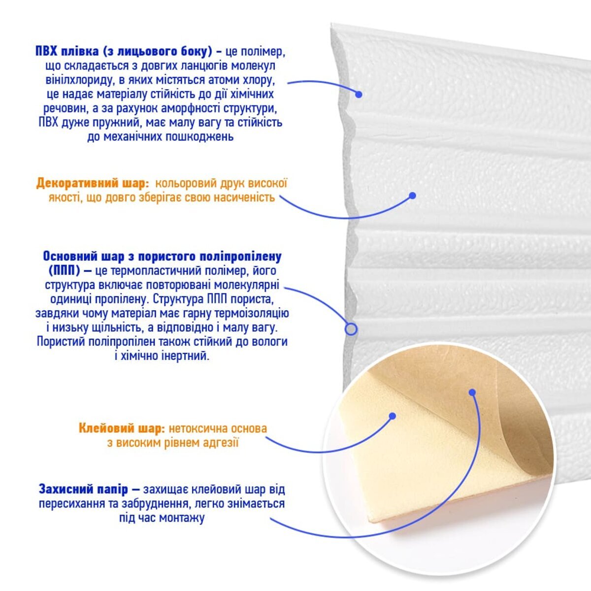 - Декоративний шар: кольоровий друк високої якості, що довго зберігає свою насиченість.