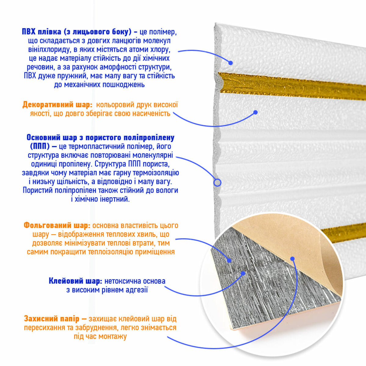 - Декоративний шар: кольоровий друк високої якості, що довго зберігає свою насиченість.
