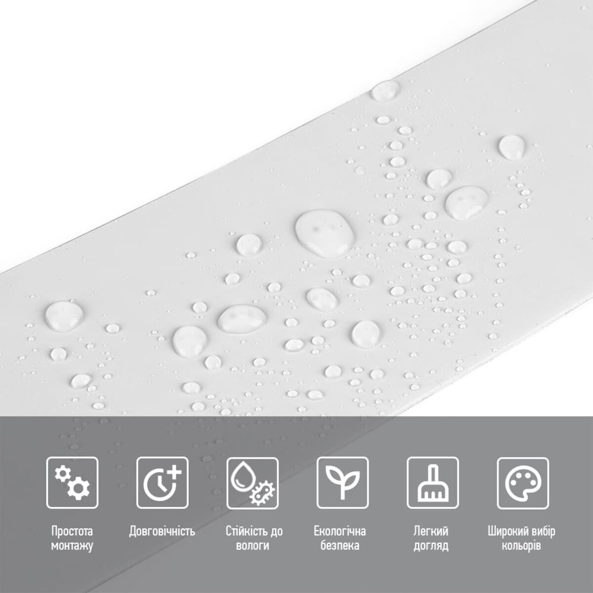 - Стійкість до вологи: вінілові плінтуси стійкі до вологи, що робить їх відмінним вибором для ванних кімнат, кухонь та інших приміщень з підвищеною вологістю, матеріал стійкий також до впливу пари, а також до появи плісняви. Плінтус підходить для створення фартуха кухні, можна клеїти біля плити на відстані не менше ніж 30-50 см;