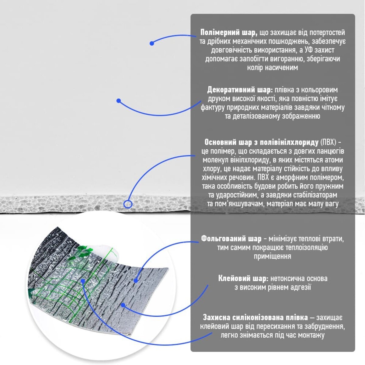 - Декоративний шар: плівка з кольоровим друком високої якості, яка повністю імітує фактуру природних матеріалів завдяки чіткому та деталізованому зображенню.