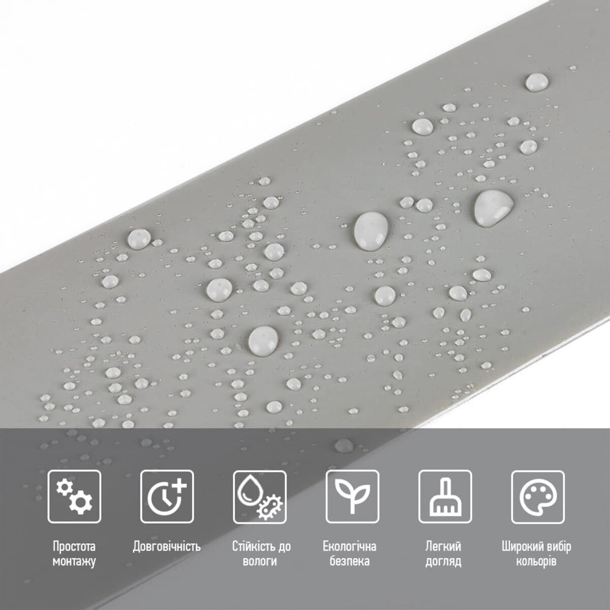 - Стійкість до вологи: вінілові плінтуси стійкі до вологи, що робить їх відмінним вибором для ванних кімнат, кухонь та інших приміщень з підвищеною вологістю, матеріал стійкий також до впливу пари, а також до появи плісняви. Плінтус підходить для створення фартуха кухні, можна клеїти біля плити на відстані не менше ніж 30-50 см;