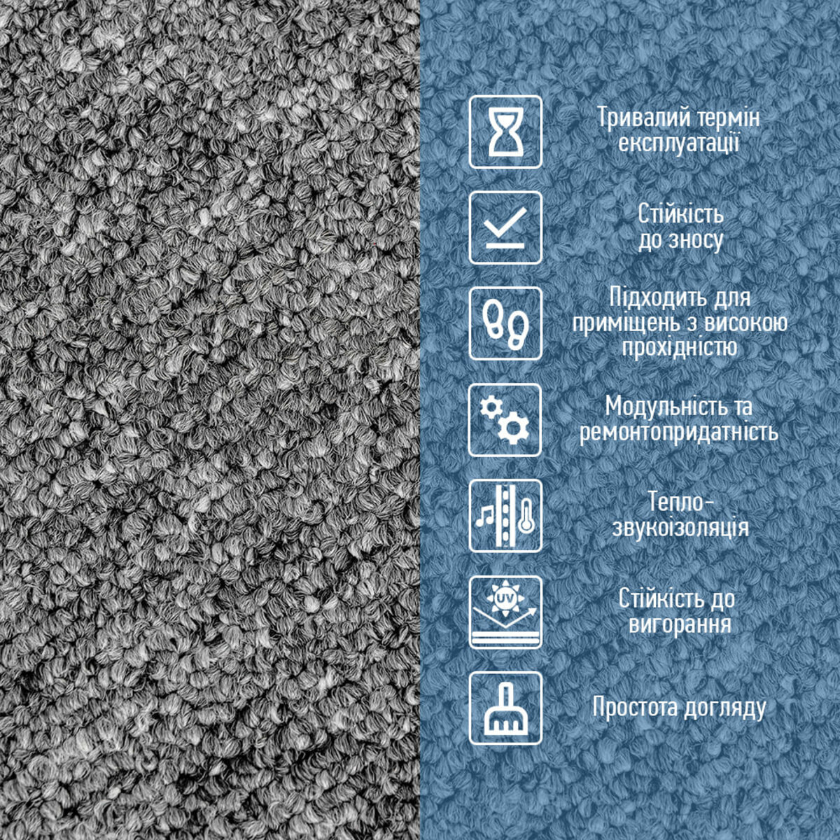 Легкість монтажуПроцес укладання максимально простий і швидкий. Ковролін укладається стик у стик, його легко різати ножицями або монтажним ножем. Для надійного фіксування можна використовувати додатковий клей, що забезпечує міцне та рівне покриття без зазорів. Матеріал не набухає та не деформується, а між смугами не утворюються щілини.Зностостійкість та тривалий термін експлуатаціїКовролін має щільний, густий ворс, який щільно прилягає і майже не піддається стиранню. Завдяки цьому покриття витримує інтенсивну експлуатацію навіть у приміщеннях з високою прохідністю, таких як коридори, офіси, магазини чи комерційні зони. Матеріал зберігає колір, структуру і форму під постійним навантаженням, забезпечуючи довговічність покриття та економію на ремонті.Стійкість до води та хімічних речовинМатеріал витримує контакт з вологою та побутовими мийними засобами, не пропускає воду і запобігає розвитку плісняви та грибка. Це робить його оптимальним для кухонь, коридорів та інших зон з підвищеною вологістю.ТеплоізоляціяКовролін здатний утримувати тепло, створюючи комфортну температуру під ногами та знижуючи витрати на опалення в холодний сезон.ЗвукоізоляціяКовролінова плитка значно знижує рівень шуму в приміщенні, роблячи його більш комфортним і затишним. Це особливо важливо для квартир, офісів та комерційних просторів.Декоративні можливостіМодульність матеріалу дозволяє створювати різноманітні комбінації дизайнів і кольорів. У наявності 6 стильних варіантів, що дає змогу підібрати ідеальне рішення під будь-який інтер’єр. Для неоднотонних позицій можна застосовувати варіативність розташування плиток, створюючи унікальні малюнки та декоративні ефекти.Догляд та чисткаПокриття легко чиститься пилососом або вологим прибиранням. Завдяки своїй структурі, воно не накопичує бруд і пил, що забезпечує простий і швидкий догляд.Модульність і ремонтопридатністьКожна плитка окремо замінюється у разі пошкодження, що робить ремонт простим і економічним, без необхідності демонтажу всього покриття.Стабільність розмірівПлитки не деформуються з часом, зберігаючи чіткі геометричні параметри навіть при зміні температури та вологості.Розрахунок потрібної кількості матеріалу: