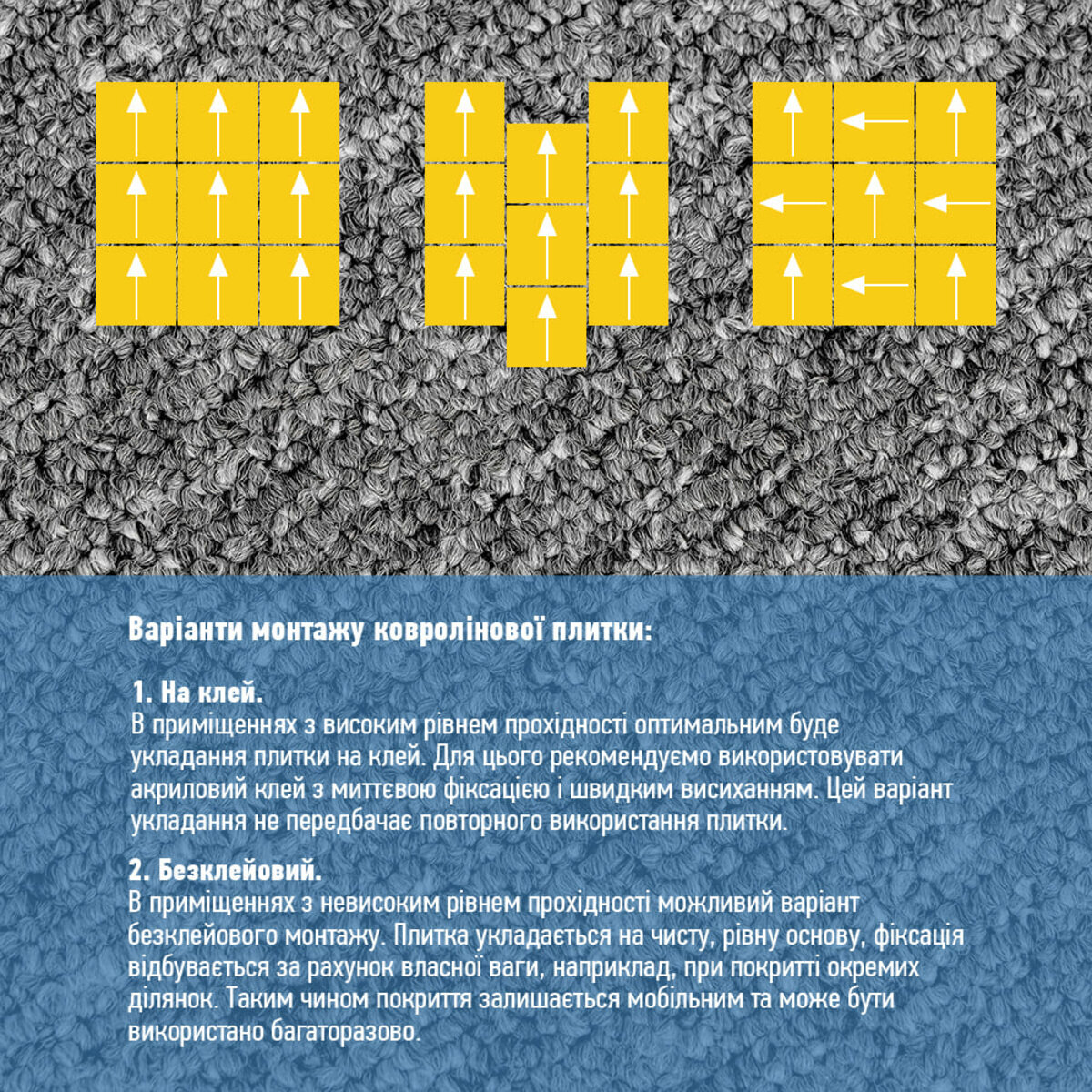 Необхідно переконатися, що поверхня, на яку передбачається клеїти плитку, відповідає вищезазначеним вимогам. У приміщенні не повинно бути протягів під час проведення монтажних робіт.Для надійної фіксації ковроліну у плиткахвикористовуйте:- Акриловий клей – наноситься тонкою смужкою по периметру плитки, приблизно 2 см від краю плитки.- Акрилово-дисперсійний (водно-дисперсійний) клей – наноситься суцільним шаром по всій зворотній поверхні плитки.Починайте монтаж з одного кута приміщення. Акуратно притискайте плитку до поверхні, контролюючи рівність укладання та уникаючи появи бульбашок і зморшок. Це забезпечить правильне позиціонування і основу для наступних плиток.Наступну плитку встановлюйте ребром до стику з попередньою. Притискайте рівномірно по всій площі, щоб досягти щільного прилягання та виключити утворення повітряних кишень.При необхідності обрізайте плитку за допомогою канцелярського ножа або ножиць, щоб підігнати її до розмірів приміщення та забезпечити акуратне завершення монтажу.Фінальна фіксація. Після укладання дайте клею повністю висохнути відповідно до інструкції виробника (зазвичай 24 години), перш ніж експлуатувати покриття. Це гарантує надійну фіксацію плиток і довговічність покриття.