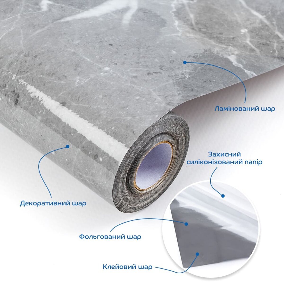Ламінований шар - верхній шар, який захищає плівку від подряпин, плям та впливу вологи. Ламінований шар додає глянцевий вигляд, а також забезпечує легке очищення від забруднень. Ламінований шар нанесений методом низькотемпературної ламінації, при якому використовують плівку з клейовою основою, що активується при помірній температурі (зазвичай 30-50°C). Плівка проходить через спеціальні вали, які нагрівають її до рівня, достатнього для надійного зчеплення з основним матеріалом, але без ризику деформації. Такий метод ідеально підходить для тонких і температурно чутливих матеріалів, таких як плівка товщиною 0,05 мм, забезпечуючи рівномірний захист і довговічність покриття.Декоративний шар. Під ламінацією знаходиться шар з декоративним друком, на якому зображено малюнок або текстура, що імітують дерево, мармур, плитку чи інші матеріали. Цей шар надає плівці візуальну привабливість, що підходить для різноманітних інтер’єрних рішень.Фольгований шар забезпечує плівці підвищену міцність, роблячи її більш стійкою до розривів, вологи та температурних перепадів. Крім того, фольга додає світловідбивний ефект, що надає поверхні яскравості та стильного вигляду.Клейовий шар нетоксична основа з високим рівнем адгезії, яка забезпечує надійне зчеплення. Захисний силіконізований папір – покриває клейовий шар до монтажу. Вона запобігає випадковому прилипанню плівки, захищає клейовий шар від пересихання та забруднення, легко знімається при монтажі. Маркування на задній поверхні захисного паперу спростить різання матеріалу. Застосування: плівка ідеально підходить для внутрішніх оздоблювальних робіт, таких як декорування та облицювання поверхонь у житлових приміщеннях (кухня, вітальня, дитяча кімната, спальня, передпокій) та комерційних просторах (офіси, зони рецепцій, магазини, салони краси, фітнес-центри), для оновлення меблів, дверей та техніки.