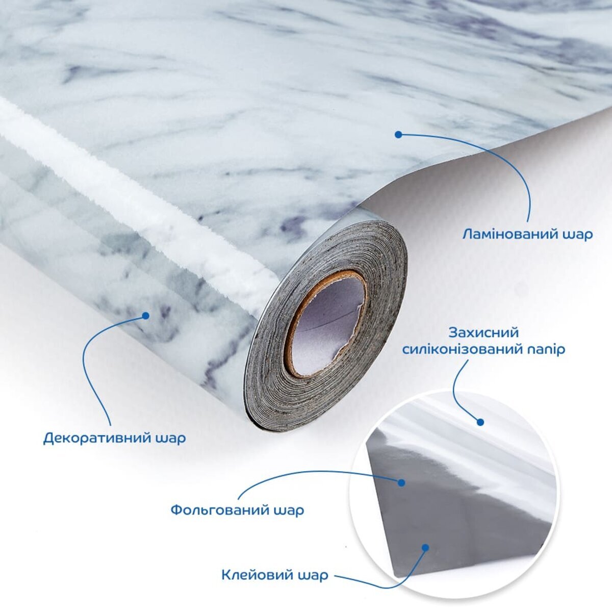 Ламінований шар - верхній шар, який захищає плівку від подряпин, плям та впливу вологи. Ламінований шар додає глянцевий вигляд, а також забезпечує легке очищення від забруднень. Ламінований шар нанесений методом низькотемпературної ламінації, при якому використовують плівку з клейовою основою, що активується при помірній температурі (зазвичай 30-50°C). Плівка проходить через спеціальні вали, які нагрівають її до рівня, достатнього для надійного зчеплення з основним матеріалом, але без ризику деформації. Такий метод ідеально підходить для тонких і температурно чутливих матеріалів, таких як плівка товщиною 0,05 мм, забезпечуючи рівномірний захист і довговічність покриття.Декоративний шар. Під ламінацією знаходиться шар з декоративним друком, на якому зображено малюнок або текстура, що імітують дерево, мармур, плитку чи інші матеріали. Цей шар надає плівці візуальну привабливість, що підходить для різноманітних інтер’єрних рішень.Фольгований шар забезпечує плівці підвищену міцність, роблячи її більш стійкою до розривів, вологи та температурних перепадів. Крім того, фольга додає світловідбивний ефект, що надає поверхні яскравості та стильного вигляду.Клейовий шар нетоксична основа з високим рівнем адгезії, яка забезпечує надійне зчеплення. Захисний силіконізований папір – покриває клейовий шар до монтажу. Вона запобігає випадковому прилипанню плівки, захищає клейовий шар від пересихання та забруднення, легко знімається при монтажі. Маркування на задній поверхні захисного паперу спростить різання матеріалу. Застосування: плівка ідеально підходить для внутрішніх оздоблювальних робіт, таких як декорування та облицювання поверхонь у житлових приміщеннях (кухня, вітальня, дитяча кімната, спальня, передпокій) та комерційних просторах (офіси, зони рецепцій, магазини, салони краси, фітнес-центри), для оновлення меблів, дверей та техніки.