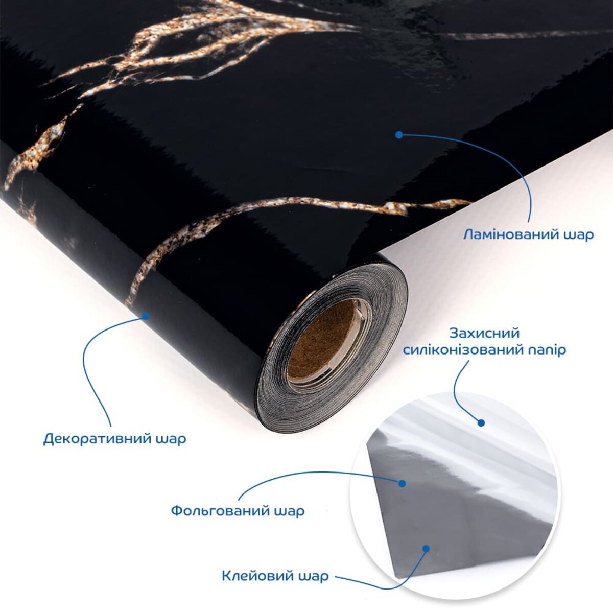 Ламінований шар - верхній шар, який захищає плівку від подряпин, плям та впливу вологи. Ламінований шар додає глянцевий вигляд, а також забезпечує легке очищення від забруднень. Ламінований шар нанесений методом низькотемпературної ламінації, при якому використовують плівку з клейовою основою, що активується при помірній температурі (зазвичай 30-50°C). Плівка проходить через спеціальні вали, які нагрівають її до рівня, достатнього для надійного зчеплення з основним матеріалом, але без ризику деформації. Такий метод ідеально підходить для тонких і температурно чутливих матеріалів, таких як плівка товщиною 0,05 мм, забезпечуючи рівномірний захист і довговічність покриття.Декоративний шар. Під ламінацією знаходиться шар з декоративним друком, на якому зображено малюнок або текстура, що імітують дерево, мармур, плитку чи інші матеріали. Цей шар надає плівці візуальну привабливість, що підходить для різноманітних інтер’єрних рішень.Фольгований шар забезпечує плівці підвищену міцність, роблячи її більш стійкою до розривів, вологи та температурних перепадів. Крім того, фольга додає світловідбивний ефект, що надає поверхні яскравості та стильного вигляду.Клейовий шар нетоксична основа з високим рівнем адгезії, яка забезпечує надійне зчеплення. Захисний силіконізований папір – покриває клейовий шар до монтажу. Вона запобігає випадковому прилипанню плівки, захищає клейовий шар від пересихання та забруднення, легко знімається при монтажі. Маркування на задній поверхні захисного паперу спростить різання матеріалу. Застосування: плівка ідеально підходить для внутрішніх оздоблювальних робіт, таких як декорування та облицювання поверхонь у житлових приміщеннях (кухня, вітальня, дитяча кімната, спальня, передпокій) та комерційних просторах (офіси, зони рецепцій, магазини, салони краси, фітнес-центри), для оновлення меблів, дверей та техніки.