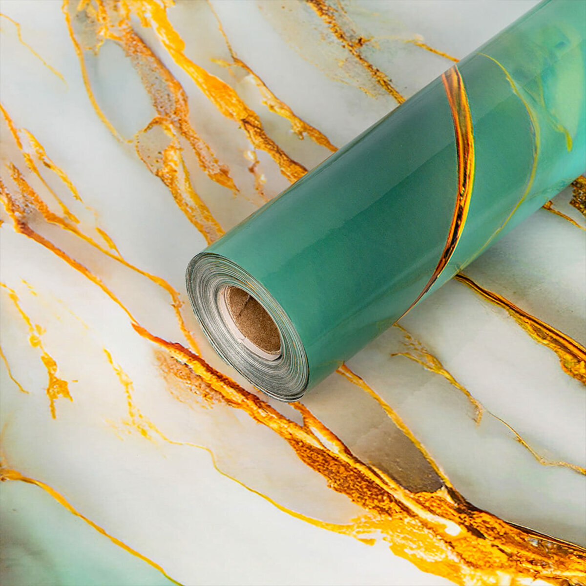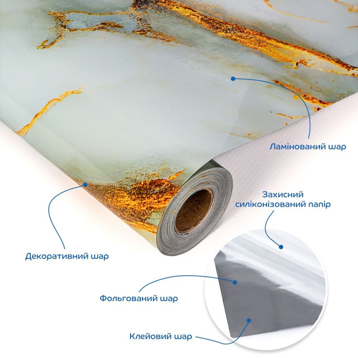 Ламінований шар - верхній шар, який захищає плівку від подряпин, плям та впливу вологи. Ламінований шар додає глянцевий вигляд, а також забезпечує легке очищення від забруднень. Ламінований шар нанесений методом низькотемпературної ламінації, при якому використовують плівку з клейовою основою, що активується при помірній температурі (зазвичай 30-50°C). Плівка проходить через спеціальні вали, які нагрівають її до рівня, достатнього для надійного зчеплення з основним матеріалом, але без ризику деформації. Такий метод ідеально підходить для тонких і температурно чутливих матеріалів, таких як плівка товщиною 0,05 мм, забезпечуючи рівномірний захист і довговічність покриття.Декоративний шар. Під ламінацією знаходиться шар з декоративним друком, на якому зображено малюнок або текстура, що імітують дерево, мармур, плитку чи інші матеріали. Цей шар надає плівці візуальну привабливість, що підходить для різноманітних інтер’єрних рішень.Фольгований шар забезпечує плівці підвищену міцність, роблячи її більш стійкою до розривів, вологи та температурних перепадів. Крім того, фольга додає світловідбивний ефект, що надає поверхні яскравості та стильного вигляду.Клейовий шар нетоксична основа з високим рівнем адгезії, яка забезпечує надійне зчеплення. Захисний силіконізований папір – покриває клейовий шар до монтажу. Вона запобігає випадковому прилипанню плівки, захищає клейовий шар від пересихання та забруднення, легко знімається при монтажі. Маркування на задній поверхні захисного паперу спростить різання матеріалу. Застосування: плівка ідеально підходить для внутрішніх оздоблювальних робіт, таких як декорування та облицювання поверхонь у житлових приміщеннях (кухня, вітальня, дитяча кімната, спальня, передпокій) та комерційних просторах (офіси, зони рецепцій, магазини, салони краси, фітнес-центри), для оновлення меблів, дверей та техніки.
