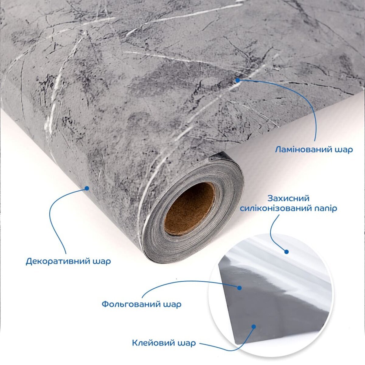 Ламінований шар - верхній шар, який захищає плівку від подряпин, плям та впливу вологи. Ламінований шар додає глянцевий вигляд, а також забезпечує легке очищення від забруднень. Ламінований шар нанесений методом низькотемпературної ламінації, при якому використовують плівку з клейовою основою, що активується при помірній температурі (зазвичай 30-50°C). Плівка проходить через спеціальні вали, які нагрівають її до рівня, достатнього для надійного зчеплення з основним матеріалом, але без ризику деформації. Такий метод ідеально підходить для тонких і температурно чутливих матеріалів, таких як плівка товщиною 0,05 мм, забезпечуючи рівномірний захист і довговічність покриття.Декоративний шар. Під ламінацією знаходиться шар з декоративним друком, на якому зображено малюнок або текстура, що імітують дерево, мармур, плитку чи інші матеріали. Цей шар надає плівці візуальну привабливість, що підходить для різноманітних інтер’єрних рішень.Фольгований шар забезпечує плівці підвищену міцність, роблячи її більш стійкою до розривів, вологи та температурних перепадів. Крім того, фольга додає світловідбивний ефект, що надає поверхні яскравості та стильного вигляду.Клейовий шар нетоксична основа з високим рівнем адгезії, яка забезпечує надійне зчеплення. Захисний силіконізований папір – покриває клейовий шар до монтажу. Вона запобігає випадковому прилипанню плівки, захищає клейовий шар від пересихання та забруднення, легко знімається при монтажі. Маркування на задній поверхні захисного паперу спростить різання матеріалу. Застосування: плівка ідеально підходить для внутрішніх оздоблювальних робіт, таких як декорування та облицювання поверхонь у житлових приміщеннях (кухня, вітальня, дитяча кімната, спальня, передпокій) та комерційних просторах (офіси, зони рецепцій, магазини, салони краси, фітнес-центри), для оновлення меблів, дверей та техніки.