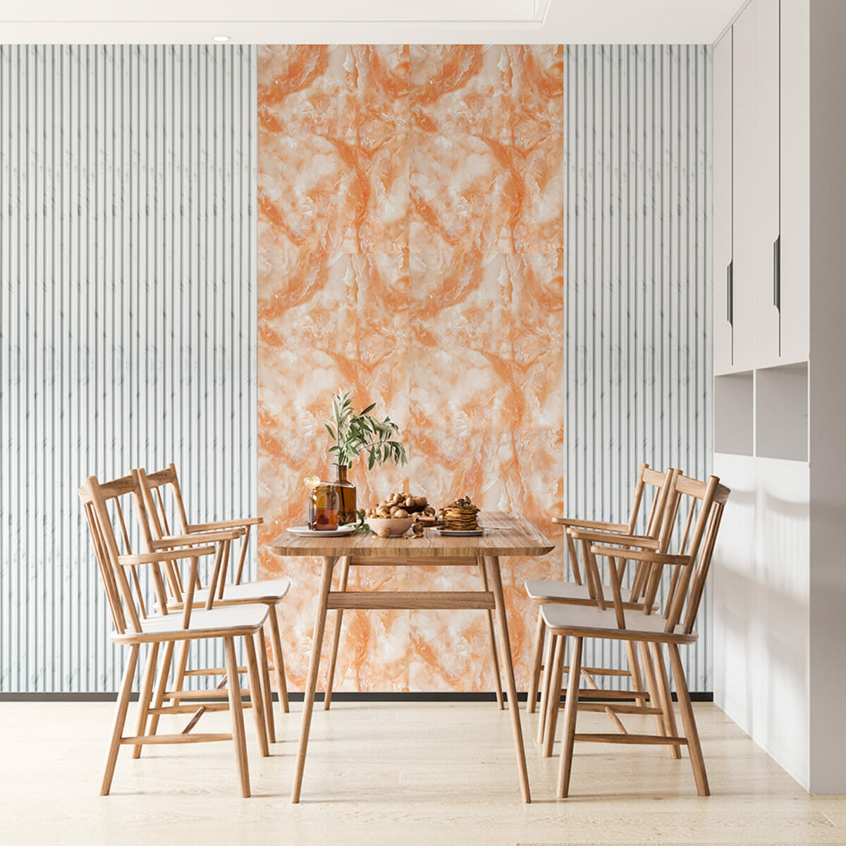Ламінований шар - верхній шар, який захищає плівку від подряпин, плям та впливу вологи. Ламінований шар додає глянцевий вигляд, а також забезпечує легке очищення від забруднень. Ламінований шар нанесений методом низькотемпературної ламінації, при якому використовують плівку з клейовою основою, що активується при помірній температурі (зазвичай 30-50°C). Плівка проходить через спеціальні вали, які нагрівають її до рівня, достатнього для надійного зчеплення з основним матеріалом, але без ризику деформації. Такий метод ідеально підходить для тонких і температурно чутливих матеріалів, таких як плівка товщиною 0,05 мм, забезпечуючи рівномірний захист і довговічність покриття.Декоративний шар. Під ламінацією знаходиться шар з декоративним друком, на якому зображено малюнок або текстура, що імітують дерево, мармур, плитку чи інші матеріали. Цей шар надає плівці візуальну привабливість, що підходить для різноманітних інтер’єрних рішень.Фольгований шар забезпечує плівці підвищену міцність, роблячи її більш стійкою до розривів, вологи та температурних перепадів. Крім того, фольга додає світловідбивний ефект, що надає поверхні яскравості та стильного вигляду.Клейовий шар нетоксична основа з високим рівнем адгезії, яка забезпечує надійне зчеплення. Захисний силіконізований папір – покриває клейовий шар до монтажу. Вона запобігає випадковому прилипанню плівки, захищає клейовий шар від пересихання та забруднення, легко знімається при монтажі. Маркування на задній поверхні захисного паперу спростить різання матеріалу. Застосування: плівка ідеально підходить для внутрішніх оздоблювальних робіт, таких як декорування та облицювання поверхонь у житлових приміщеннях (кухня, вітальня, дитяча кімната, спальня, передпокій) та комерційних просторах (офіси, зони рецепцій, магазини, салони краси, фітнес-центри), для оновлення меблів, дверей та техніки.