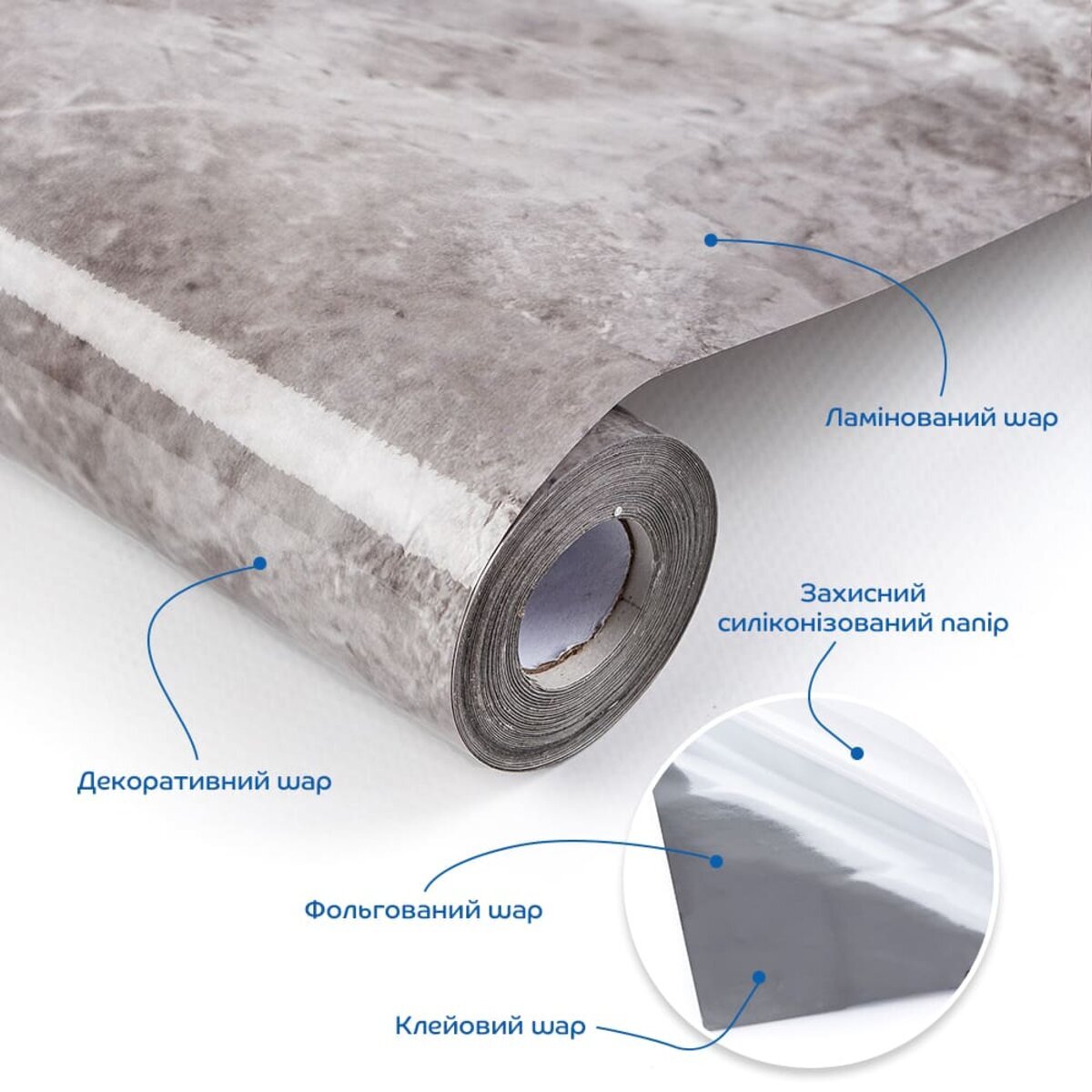 Ламінований шар - верхній шар, який захищає плівку від подряпин, плям та впливу вологи. Ламінований шар додає глянцевий вигляд, а також забезпечує легке очищення від забруднень. Ламінований шар нанесений методом низькотемпературної ламінації, при якому використовують плівку з клейовою основою, що активується при помірній температурі (зазвичай 30-50°C). Плівка проходить через спеціальні вали, які нагрівають її до рівня, достатнього для надійного зчеплення з основним матеріалом, але без ризику деформації. Такий метод ідеально підходить для тонких і температурно чутливих матеріалів, таких як плівка товщиною 0,05 мм, забезпечуючи рівномірний захист і довговічність покриття.Декоративний шар. Під ламінацією знаходиться шар з декоративним друком, на якому зображено малюнок або текстура, що імітують дерево, мармур, плитку чи інші матеріали. Цей шар надає плівці візуальну привабливість, що підходить для різноманітних інтер’єрних рішень.Фольгований шар забезпечує плівці підвищену міцність, роблячи її більш стійкою до розривів, вологи та температурних перепадів. Крім того, фольга додає світловідбивний ефект, що надає поверхні яскравості та стильного вигляду.Клейовий шар нетоксична основа з високим рівнем адгезії, яка забезпечує надійне зчеплення. Захисний силіконізований папір – покриває клейовий шар до монтажу. Вона запобігає випадковому прилипанню плівки, захищає клейовий шар від пересихання та забруднення, легко знімається при монтажі. Маркування на задній поверхні захисного паперу спростить різання матеріалу. Застосування: плівка ідеально підходить для внутрішніх оздоблювальних робіт, таких як декорування та облицювання поверхонь у житлових приміщеннях (кухня, вітальня, дитяча кімната, спальня, передпокій) та комерційних просторах (офіси, зони рецепцій, магазини, салони краси, фітнес-центри), для оновлення меблів, дверей та техніки.