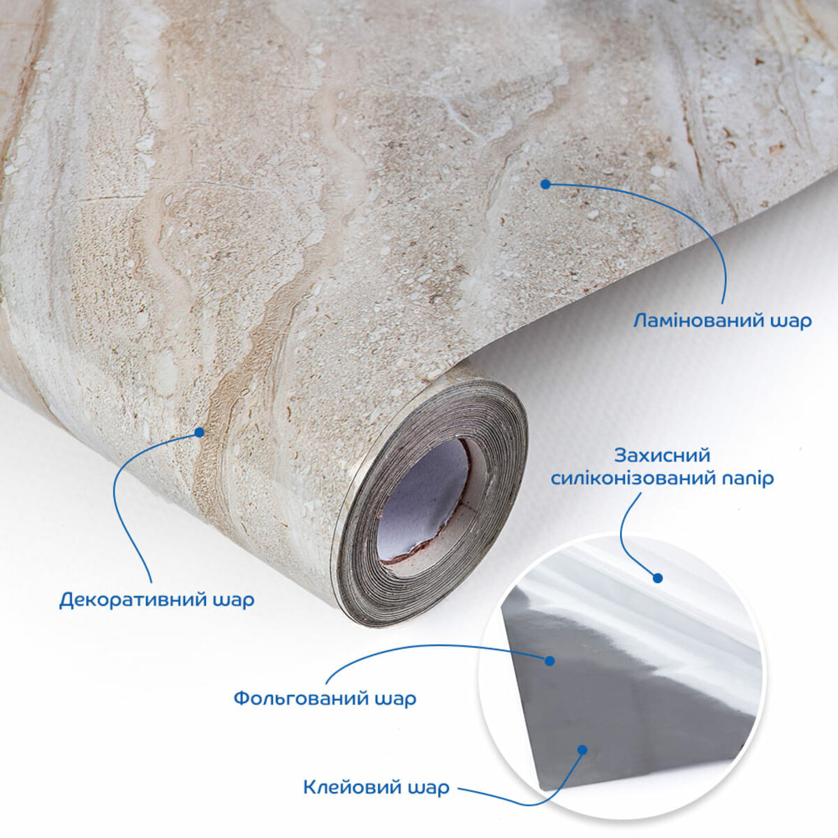 Ламінований шар - верхній шар, який захищає плівку від подряпин, плям та впливу вологи. Ламінований шар додає глянцевий вигляд, а також забезпечує легке очищення від забруднень. Ламінований шар нанесений методом низькотемпературної ламінації, при якому використовують плівку з клейовою основою, що активується при помірній температурі (зазвичай 30-50°C). Плівка проходить через спеціальні вали, які нагрівають її до рівня, достатнього для надійного зчеплення з основним матеріалом, але без ризику деформації. Такий метод ідеально підходить для тонких і температурно чутливих матеріалів, таких як плівка товщиною 0,05 мм, забезпечуючи рівномірний захист і довговічність покриття.Декоративний шар. Під ламінацією знаходиться шар з декоративним друком, на якому зображено малюнок або текстура, що імітують дерево, мармур, плитку чи інші матеріали. Цей шар надає плівці візуальну привабливість, що підходить для різноманітних інтер’єрних рішень.Фольгований шар забезпечує плівці підвищену міцність, роблячи її більш стійкою до розривів, вологи та температурних перепадів. Крім того, фольга додає світловідбивний ефект, що надає поверхні яскравості та стильного вигляду.Клейовий шар нетоксична основа з високим рівнем адгезії, яка забезпечує надійне зчеплення. Захисний силіконізований папір – покриває клейовий шар до монтажу. Вона запобігає випадковому прилипанню плівки, захищає клейовий шар від пересихання та забруднення, легко знімається при монтажі. Маркування на задній поверхні захисного паперу спростить різання матеріалу. Застосування: плівка ідеально підходить для внутрішніх оздоблювальних робіт, таких як декорування та облицювання поверхонь у житлових приміщеннях (кухня, вітальня, дитяча кімната, спальня, передпокій) та комерційних просторах (офіси, зони рецепцій, магазини, салони краси, фітнес-центри), для оновлення меблів, дверей та техніки.