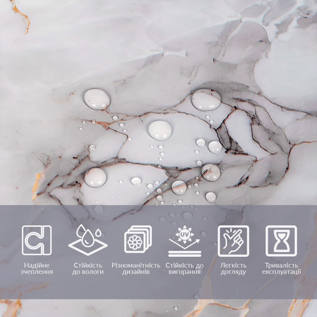 Підвищена міцність: завдяки фольгованій основі, плівка має високу стійкість до розривів — її практично неможливо розірвати без попереднього надрізу. Це забезпечує довговічність та полегшує монтаж.Зносостійкість: Ламінований шар забезпечує ефективний захист поверхні від подряпин, плям, пилу та забруднень, що допомагає зберегти її первісний вигляд. Завдяки цьому шарові плівка залишається гладкою та привабливою навіть при інтенсивному використанні, а також легко очищується від забруднень, що продовжує термін її служби.Вологостійкість: завдяки ламінації, плівка має підвищену стійкість до вологи, що робить її ідеальною для використання у приміщеннях з підвищеною вологістю, таких як кухня чи ванна кімната.Висока адгезія: клейовий шар забезпечує надійне зчеплення з різними поверхнями, такими як метал, скло, пластик і ламіноване дерево, що робить плівку універсальним рішенням для декору, захисту та відновлення.Стійкість до зовнішніх умов: Плівка витримує вплив ультрафіолету, що захищає її від вигорання і дозволяє довго зберігати насиченість кольору, навіть в умовах інтенсивної експлуатації.Тонкість і гнучкість: Завдяки невеликій товщині плівка легко формується та підходить для нанесення на складні або вигнуті поверхні, забезпечуючи точне прилягання.Широкий вибір дизайнів: Великий асортимент текстур, кольорів та дизайнів дає можливість підібрати оптимальне рішення для будь-якого інтер’єру або стилю.Вимоги до поверхонь