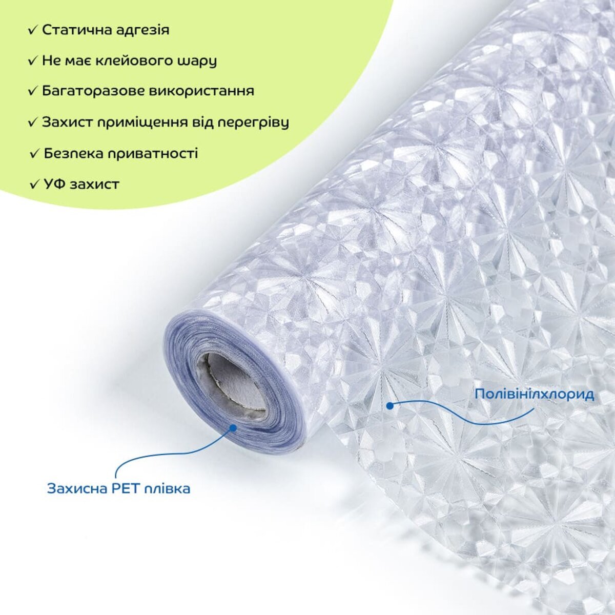 Естетика та ефект освітлення: віконні плівки можуть надати вікнам унікальний вигляд і створити ефект веселки при потраплянні сонячного світла. Вони стануть стильною альтернативою традиційним шторам і жалюзі, додаючи елегантності в інтер'єр.Захист від УФ-випромінювання: плівки блокують УФ-промені, що допоможе захистити меблі та інші предмети інтер'єру від вицвітання.Конфіденційність: напівпрозорі плівки захищають від небажаних поглядів, одночасно пропускаючи м'яке природне світло в приміщення. Легкість у використанні: Плівки не потребують клею для установки, що спрощує процес нанесення та видалення. Завдяки мильній воді можна легко виправити положення плівки під час монтажу. Багаторазовість: завдяки відсутності клейового шару, віконні плівки можна легко знімати і повторно наносити. Це дозволяє змінювати дизайн у будь-який час без значних витрат, а також дає можливість експериментувати з різними стилями.Контроль температури: ПВХ плівка допомагає зберігати прохолодну температуру в приміщенні, оскільки відбиває частину сонячного світла та зменшує теплопередачу через вікна. Це дозволяє знизити перегрів кімнати в літній період і підвищує енергоефективність, зменшуючи навантаження на кондиціонери.Універсальність та легкість в монтажі: ПВХ плівки можна легко різати ножицями або монтажним ножем, що дозволяє використовувати їх у різних місцях: на вікнах, розсувних дверях, кухонних шафах та інших скляних поверхнях.Довговічність і зносостійкість: віконні плівки ПВХ мають високу стійкість до механічних ушкоджень, що забезпечує їх тривалу експлуатацію навіть за різноманітних погодних умов.Легке очищення: ПВХ плівки легко чистяться, що дозволяє зберігати їх в хорошому стані з мінімальними зусиллями.