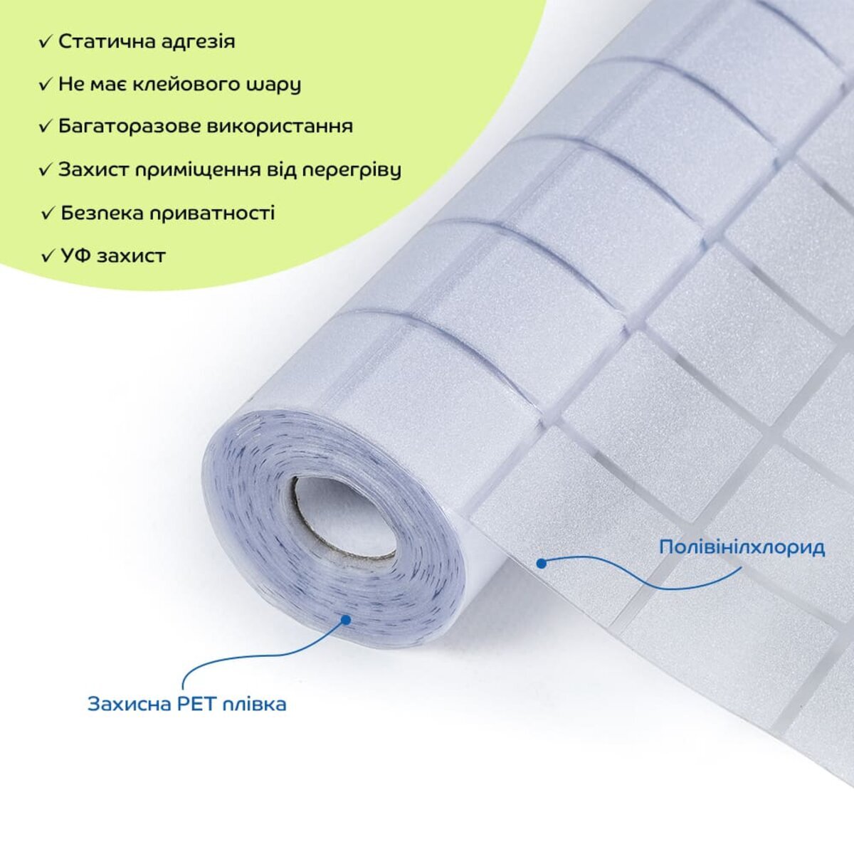 Естетика та ефект освітлення: віконні плівки можуть надати вікнам унікальний вигляд і створити ефект веселки при потраплянні сонячного світла. Вони стануть стильною альтернативою традиційним шторам і жалюзі, додаючи елегантності в інтер'єр.Захист від УФ-випромінювання: плівки блокують УФ-промені, що допоможе захистити меблі та інші предмети інтер'єру від вицвітання.Конфіденційність: напівпрозорі плівки захищають від небажаних поглядів, одночасно пропускаючи м'яке природне світло в приміщення. Легкість у використанні: Плівки не потребують клею для установки, що спрощує процес нанесення та видалення. Завдяки мильній воді можна легко виправити положення плівки під час монтажу. Багаторазовість: завдяки відсутності клейового шару, віконні плівки можна легко знімати і повторно наносити. Це дозволяє змінювати дизайн у будь-який час без значних витрат, а також дає можливість експериментувати з різними стилями.Контроль температури: ПВХ плівка допомагає зберігати прохолодну температуру в приміщенні, оскільки відбиває частину сонячного світла та зменшує теплопередачу через вікна. Це дозволяє знизити перегрів кімнати в літній період і підвищує енергоефективність, зменшуючи навантаження на кондиціонери.Універсальність та легкість в монтажі: ПВХ плівки можна легко різати ножицями або монтажним ножем, що дозволяє використовувати їх у різних місцях: на вікнах, розсувних дверях, кухонних шафах та інших скляних поверхнях.Довговічність і зносостійкість: віконні плівки ПВХ мають високу стійкість до механічних ушкоджень, що забезпечує їх тривалу експлуатацію навіть за різноманітних погодних умов.Легке очищення: ПВХ плівки легко чистяться, що дозволяє зберігати їх в хорошому стані з мінімальними зусиллями.