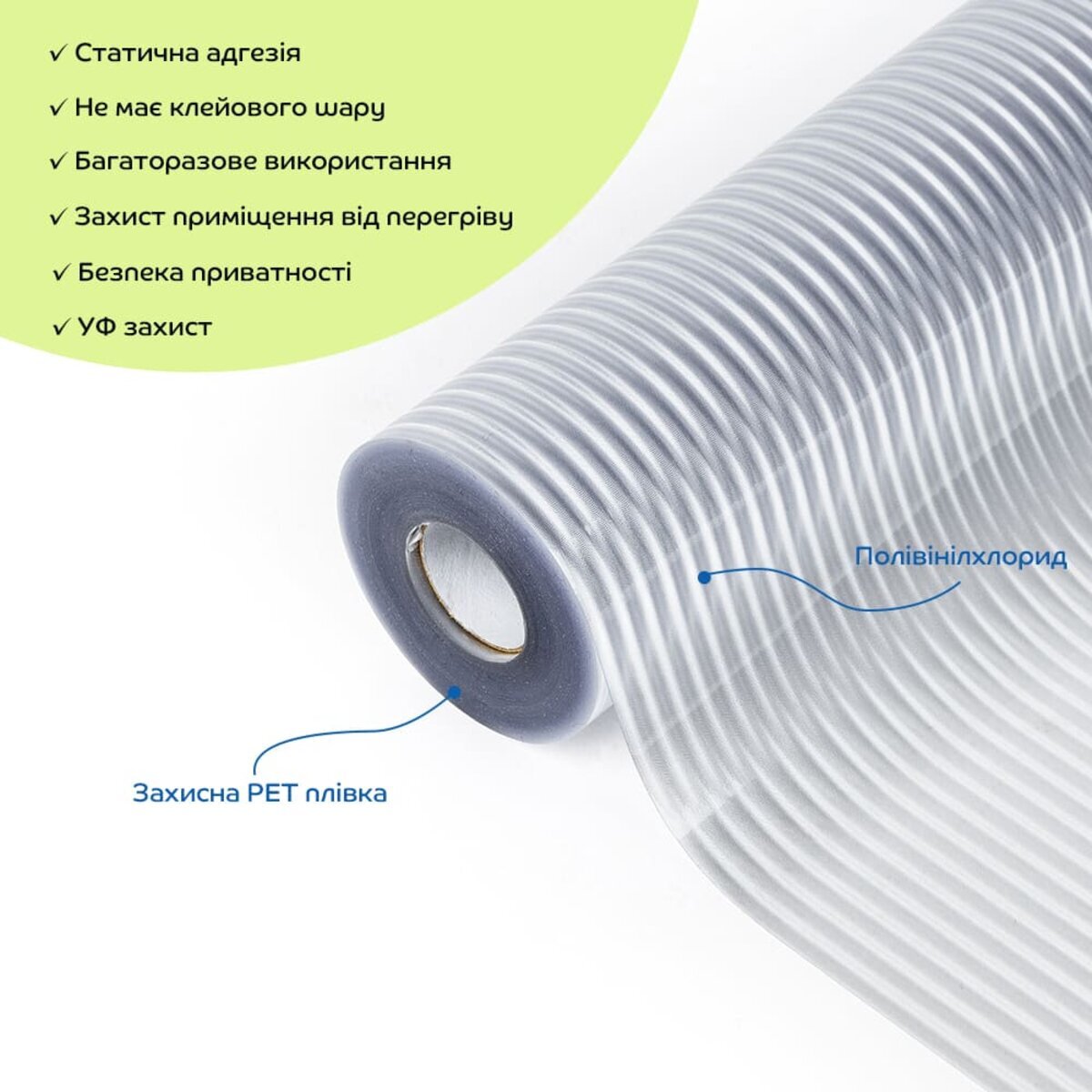 Естетика та ефект освітлення: віконні плівки можуть надати вікнам унікальний вигляд і створити ефект веселки при потраплянні сонячного світла. Вони стануть стильною альтернативою традиційним шторам і жалюзі, додаючи елегантності в інтер'єр.Захист від УФ-випромінювання: плівки блокують УФ-промені, що допоможе захистити меблі та інші предмети інтер'єру від вицвітання.Конфіденційність: напівпрозорі плівки захищають від небажаних поглядів, одночасно пропускаючи м'яке природне світло в приміщення. Легкість у використанні: Плівки не потребують клею для установки, що спрощує процес нанесення та видалення. Завдяки мильній воді можна легко виправити положення плівки під час монтажу. Багаторазовість: завдяки відсутності клейового шару, віконні плівки можна легко знімати і повторно наносити. Це дозволяє змінювати дизайн у будь-який час без значних витрат, а також дає можливість експериментувати з різними стилями.Контроль температури: ПВХ плівка допомагає зберігати прохолодну температуру в приміщенні, оскільки відбиває частину сонячного світла та зменшує теплопередачу через вікна. Це дозволяє знизити перегрів кімнати в літній період і підвищує енергоефективність, зменшуючи навантаження на кондиціонери.Універсальність та легкість в монтажі: ПВХ плівки можна легко різати ножицями або монтажним ножем, що дозволяє використовувати їх у різних місцях: на вікнах, розсувних дверях, кухонних шафах та інших скляних поверхнях.Довговічність і зносостійкість: віконні плівки ПВХ мають високу стійкість до механічних ушкоджень, що забезпечує їх тривалу експлуатацію навіть за різноманітних погодних умов.Легке очищення: ПВХ плівки легко чистяться, що дозволяє зберігати їх в хорошому стані з мінімальними зусиллями.