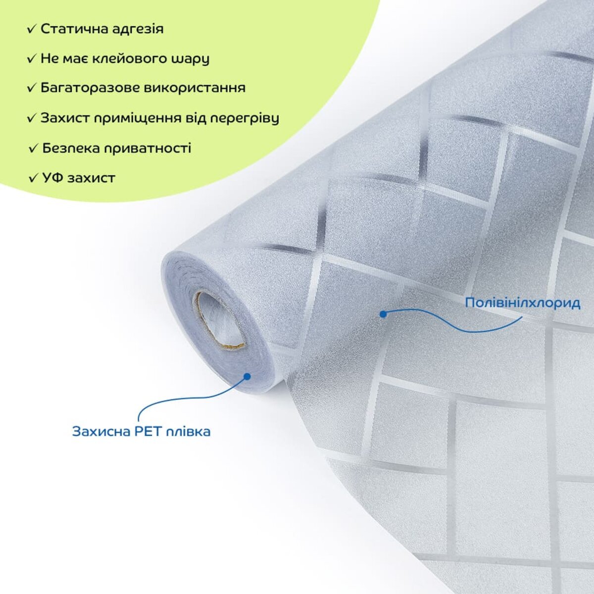 Естетика та ефект освітлення: віконні плівки можуть надати вікнам унікальний вигляд і створити ефект веселки при потраплянні сонячного світла. Вони стануть стильною альтернативою традиційним шторам і жалюзі, додаючи елегантності в інтер'єр.Захист від УФ-випромінювання: плівки блокують УФ-промені, що допоможе захистити меблі та інші предмети інтер'єру від вицвітання.Конфіденційність: напівпрозорі плівки захищають від небажаних поглядів, одночасно пропускаючи м'яке природне світло в приміщення. Легкість у використанні: Плівки не потребують клею для установки, що спрощує процес нанесення та видалення. Завдяки мильній воді можна легко виправити положення плівки під час монтажу. Багаторазовість: завдяки відсутності клейового шару, віконні плівки можна легко знімати і повторно наносити. Це дозволяє змінювати дизайн у будь-який час без значних витрат, а також дає можливість експериментувати з різними стилями.Контроль температури: ПВХ плівка допомагає зберігати прохолодну температуру в приміщенні, оскільки відбиває частину сонячного світла та зменшує теплопередачу через вікна. Це дозволяє знизити перегрів кімнати в літній період і підвищує енергоефективність, зменшуючи навантаження на кондиціонери.Універсальність та легкість в монтажі: ПВХ плівки можна легко різати ножицями або монтажним ножем, що дозволяє використовувати їх у різних місцях: на вікнах, розсувних дверях, кухонних шафах та інших скляних поверхнях.Довговічність і зносостійкість: віконні плівки ПВХ мають високу стійкість до механічних ушкоджень, що забезпечує їх тривалу експлуатацію навіть за різноманітних погодних умов.Легке очищення: ПВХ плівки легко чистяться, що дозволяє зберігати їх в хорошому стані з мінімальними зусиллями.