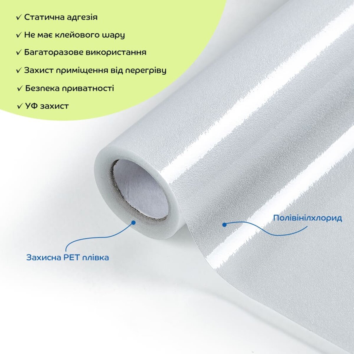 Естетика та ефект освітлення: віконні плівки можуть надати вікнам унікальний вигляд і створити ефект веселки при потраплянні сонячного світла. Вони стануть стильною альтернативою традиційним шторам і жалюзі, додаючи елегантності в інтер'єр.Захист від УФ-випромінювання: плівки блокують УФ-промені, що допоможе захистити меблі та інші предмети інтер'єру від вицвітання.Конфіденційність: напівпрозорі плівки захищають від небажаних поглядів, одночасно пропускаючи м'яке природне світло в приміщення. Легкість у використанні: Плівки не потребують клею для установки, що спрощує процес нанесення та видалення. Завдяки мильній воді можна легко виправити положення плівки під час монтажу. Багаторазовість: завдяки відсутності клейового шару, віконні плівки можна легко знімати і повторно наносити. Це дозволяє змінювати дизайн у будь-який час без значних витрат, а також дає можливість експериментувати з різними стилями.Контроль температури: ПВХ плівка допомагає зберігати прохолодну температуру в приміщенні, оскільки відбиває частину сонячного світла та зменшує теплопередачу через вікна. Це дозволяє знизити перегрів кімнати в літній період і підвищує енергоефективність, зменшуючи навантаження на кондиціонери.Універсальність та легкість в монтажі: ПВХ плівки можна легко різати ножицями або монтажним ножем, що дозволяє використовувати їх у різних місцях: на вікнах, розсувних дверях, кухонних шафах та інших скляних поверхнях.Довговічність і зносостійкість: віконні плівки ПВХ мають високу стійкість до механічних ушкоджень, що забезпечує їх тривалу експлуатацію навіть за різноманітних погодних умов.Легке очищення: ПВХ плівки легко чистяться, що дозволяє зберігати їх в хорошому стані з мінімальними зусиллями.