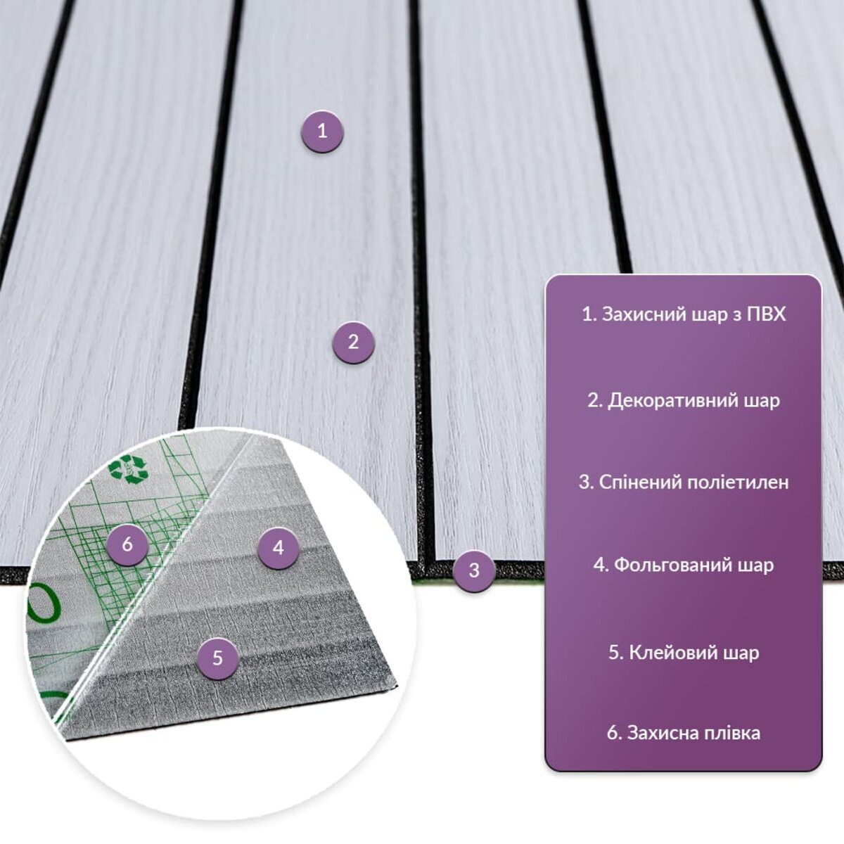 Захисний шар з ПВХ, захищає від потертостей та дрібних механічних пошкоджень, забезпечує довговічність використання, а УФ захист допомагає запобігти вигоранню, зберігаючи колір насиченим, за рахунок чого вінілова рейка довго має свій первісний естетичний вигляд.Також шар з ПВХ має стійкість до дії хімічних речовин, а за рахунок аморфності кристалічних ґрат ПВХ, дуже пружна, має малу вагу. Декоративний шар: плівка з кольоровим друком високої роздільної якості, яка повністю імітує фактуру природних матеріалів завдяки чіткому та деталізованому зображенню. Вспінений поліетилен (РЕ) - це полімерний матеріал із закритопористою структурою, легкий і гнучкий, має відмінні теплоізоляційні, звукоізоляційні та амортизаційні властивості, стійкий до вологи. Фольгований шар: основна властивість цього шару – відображення теплових хвиль, що дозволяє мінімізувати теплові втрати, тим самим покращити теплоізоляцію приміщення. Клейовий шар: нетоксична основа з високим рівнем адгезії.Захисна плівка – оберігає клейовий шар від пересихання та забруднення, легко знімається під час монтажу. Температурний режим: під впливом високих температур можуть деформуватися. У кухонній зоні поруч із джерелами вогню встановлення вінілової рейки необхідно проводити на відстані 30-50 см.