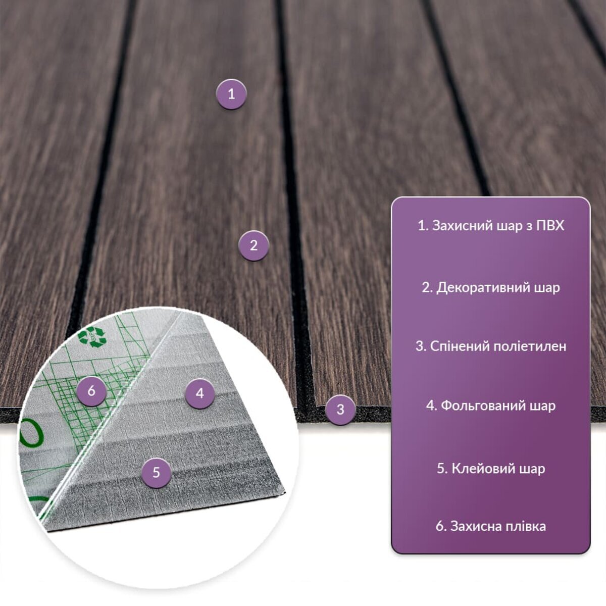 Захисний шар з ПВХ, захищає від потертостей та дрібних механічних пошкоджень, забезпечує довговічність використання, а УФ захист допомагає запобігти вигоранню, зберігаючи колір насиченим, за рахунок чого вінілова рейка довго має свій первісний естетичний вигляд.Також шар з ПВХ має стійкість до дії хімічних речовин, а за рахунок аморфності кристалічних ґрат ПВХ, дуже пружна, має малу вагу. Декоративний шар: плівка з кольоровим друком високої роздільної якості, яка повністю імітує фактуру природних матеріалів завдяки чіткому та деталізованому зображенню. Вспінений поліетилен (РЕ) - це полімерний матеріал із закритопористою структурою, легкий і гнучкий, має відмінні теплоізоляційні, звукоізоляційні та амортизаційні властивості, стійкий до вологи. Фольгований шар: основна властивість цього шару – відображення теплових хвиль, що дозволяє мінімізувати теплові втрати, тим самим покращити теплоізоляцію приміщення. Клейовий шар: нетоксична основа з високим рівнем адгезії.Захисна плівка – оберігає клейовий шар від пересихання та забруднення, легко знімається під час монтажу. Температурний режим: під впливом високих температур можуть деформуватися. У кухонній зоні поруч із джерелами вогню встановлення вінілової рейки необхідно проводити на відстані 30-50 см.