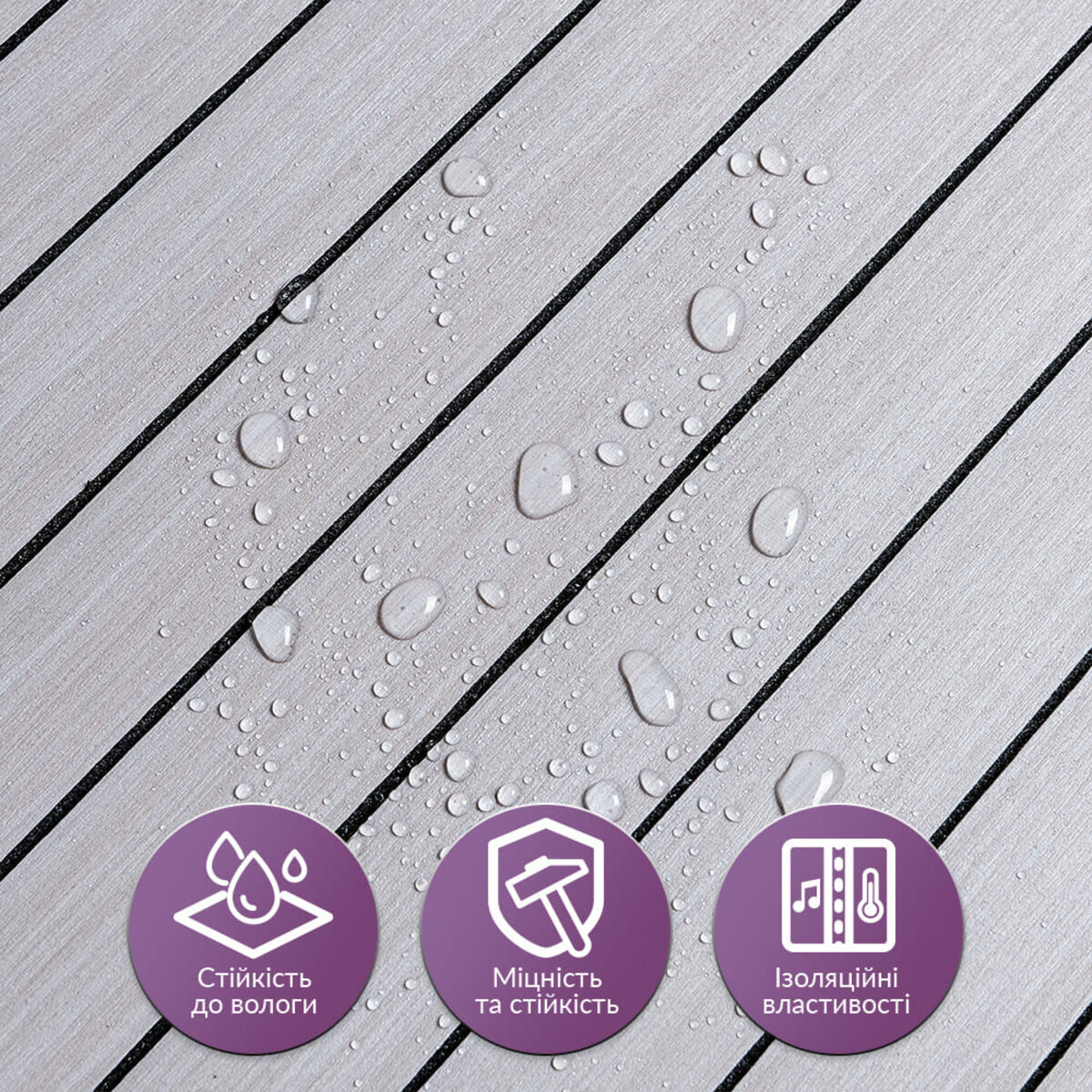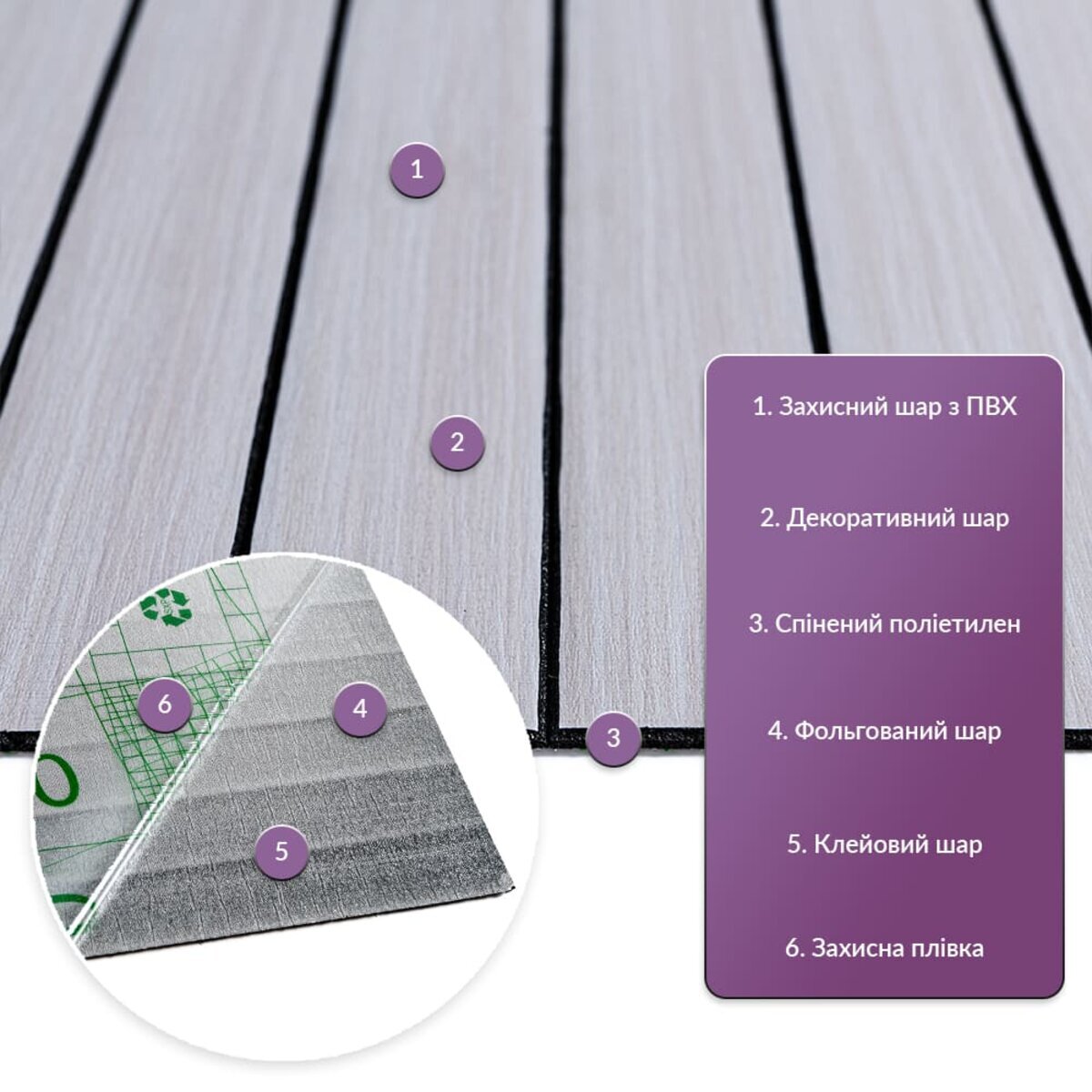 Захисний шар з ПВХ, захищає від потертостей та дрібних механічних пошкоджень, забезпечує довговічність використання, а УФ захист допомагає запобігти вигоранню, зберігаючи колір насиченим, за рахунок чого вінілова рейка довго має свій первісний естетичний вигляд.Також шар з ПВХ має стійкість до дії хімічних речовин, а за рахунок аморфності кристалічних ґрат ПВХ, дуже пружна, має малу вагу. Декоративний шар: плівка з кольоровим друком високої роздільної якості, яка повністю імітує фактуру природних матеріалів завдяки чіткому та деталізованому зображенню. Вспінений поліетилен (РЕ) - це полімерний матеріал із закритопористою структурою, легкий і гнучкий, має відмінні теплоізоляційні, звукоізоляційні та амортизаційні властивості, стійкий до вологи. Фольгований шар: основна властивість цього шару – відображення теплових хвиль, що дозволяє мінімізувати теплові втрати, тим самим покращити теплоізоляцію приміщення. Клейовий шар: нетоксична основа з високим рівнем адгезії.Захисна плівка – оберігає клейовий шар від пересихання та забруднення, легко знімається під час монтажу. Температурний режим: під впливом високих температур можуть деформуватися. У кухонній зоні поруч із джерелами вогню встановлення вінілової рейки необхідно проводити на відстані 30-50 см.