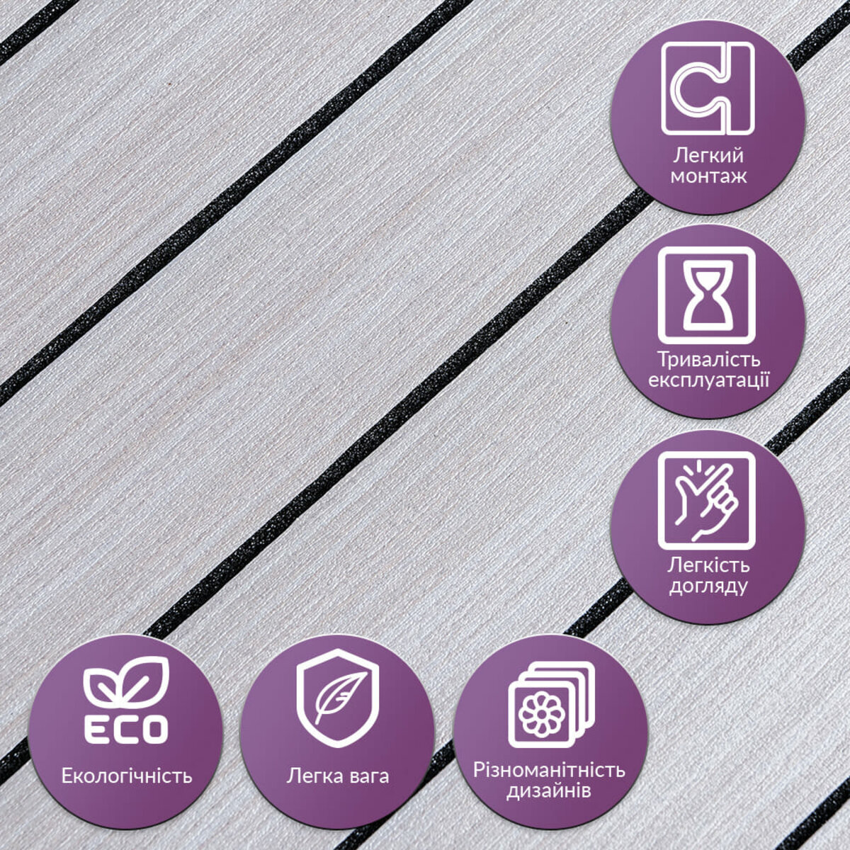 Легка установка: Завдяки клейовому шару монтаж вінілових рейок швидкий і простий, без потреби в додаткових матеріалах. Рейки легко ріжуться монтажним ножем або ножицями, укладаються стик у стик. Відсоток обрізу для настінних покриттів дуже низький. Стійкість до вологи: Вінілові рейки вологостійкі, що робить їх ідеальними для використання у вологих приміщеннях, таких як ванні кімнати та кухні. Вони не набухають і стійкі до пари та появи цвілі. Довговічність: Вінілові рейки зносостійкі, стійкі до механічних пошкоджень та подряпин, що забезпечує їх тривале використання в інтенсивно експлуатованих приміщеннях. Естетичні можливості: Широкий вибір текстур, кольорів і візерунків, що імітують натуральні матеріали. Це дозволяє підібрати рейки для будь-якого інтер'єру і створювати унікальні декоративні рішення. Також рейки можна монтувати в різних напрямках (горизонтально, вертикально або під кутом), що дає змогу реалізувати різні дизайнерські ідеї і створювати оригінальні візуальні ефекти. Легкий догляд: Вінілові рейки легко миються, не вимагають спеціальних засобів для очищення і не вбирають бруд. Ізоляційні властивості: Рейки мають відмінні тепло- і звукоізоляційні властивості, що робить їх придатними для приміщень, де важлива комфортна акустика і тепло. Екологічна безпека: Виготовляються з безпечних матеріалів, не виділяють шкідливих речовин і підлягають переробці, що робить їх екологічно чистими. Легка вага: Вінілові рейки мають малу вагу, що спрощує транспортування та монтаж. Вони ідеально підходять для використання в місцях, де потрібно мінімізувати навантаження на конструкцію, таких як тонкі перегородки або легкі стіни. Тонкий профіль з 3D-ефектом: Завдяки товщині 2,8 мм, рейки створюють привабливий 3D-ефект, не займаючи простір. Це робить їх ідеальними для використання в приміщеннях з обмеженим простором, таких як маленькі кімнати, коридори або офісні кабінети. Розрахунок потрібної кількості матеріалу: