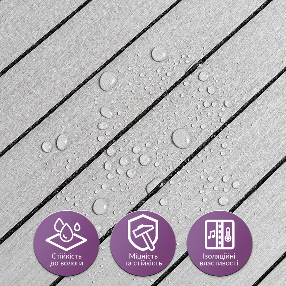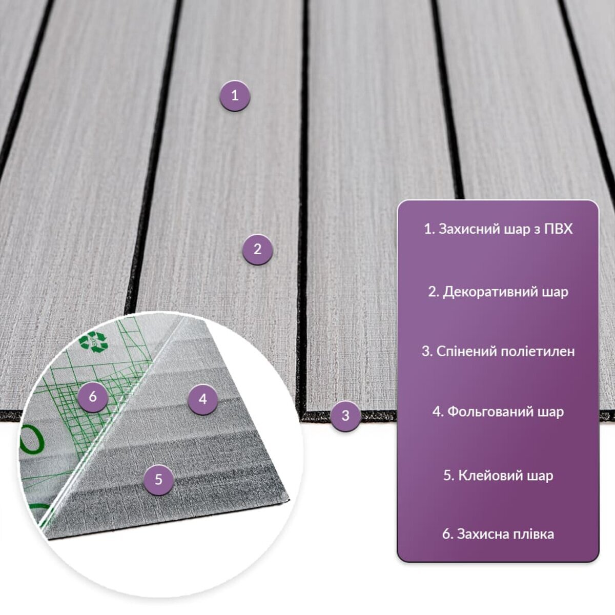 Захисний шар з ПВХ, захищає від потертостей та дрібних механічних пошкоджень, забезпечує довговічність використання, а УФ захист допомагає запобігти вигоранню, зберігаючи колір насиченим, за рахунок чого вінілова рейка довго має свій первісний естетичний вигляд.Також шар з ПВХ має стійкість до дії хімічних речовин, а за рахунок аморфності кристалічних ґрат ПВХ, дуже пружна, має малу вагу. Декоративний шар: плівка з кольоровим друком високої роздільної якості, яка повністю імітує фактуру природних матеріалів завдяки чіткому та деталізованому зображенню. Вспінений поліетилен (РЕ) - це полімерний матеріал із закритопористою структурою, легкий і гнучкий, має відмінні теплоізоляційні, звукоізоляційні та амортизаційні властивості, стійкий до вологи. Фольгований шар: основна властивість цього шару – відображення теплових хвиль, що дозволяє мінімізувати теплові втрати, тим самим покращити теплоізоляцію приміщення. Клейовий шар: нетоксична основа з високим рівнем адгезії.Захисна плівка – оберігає клейовий шар від пересихання та забруднення, легко знімається під час монтажу. Температурний режим: під впливом високих температур можуть деформуватися. У кухонній зоні поруч із джерелами вогню встановлення вінілової рейки необхідно проводити на відстані 30-50 см.
