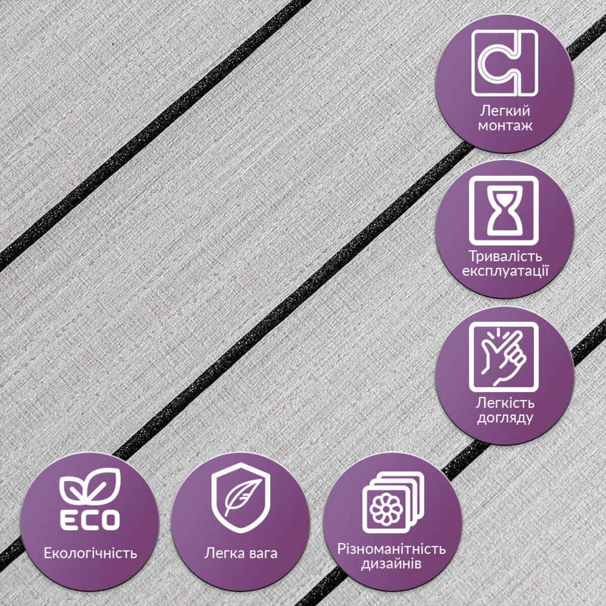 Легка установка: Завдяки клейовому шару монтаж вінілових рейок швидкий і простий, без потреби в додаткових матеріалах. Рейки легко ріжуться монтажним ножем або ножицями, укладаються стик у стик. Відсоток обрізу для настінних покриттів дуже низький. Стійкість до вологи: Вінілові рейки вологостійкі, що робить їх ідеальними для використання у вологих приміщеннях, таких як ванні кімнати та кухні. Вони не набухають і стійкі до пари та появи цвілі. Довговічність: Вінілові рейки зносостійкі, стійкі до механічних пошкоджень та подряпин, що забезпечує їх тривале використання в інтенсивно експлуатованих приміщеннях. Естетичні можливості: Широкий вибір текстур, кольорів і візерунків, що імітують натуральні матеріали. Це дозволяє підібрати рейки для будь-якого інтер'єру і створювати унікальні декоративні рішення. Також рейки можна монтувати в різних напрямках (горизонтально, вертикально або під кутом), що дає змогу реалізувати різні дизайнерські ідеї і створювати оригінальні візуальні ефекти. Легкий догляд: Вінілові рейки легко миються, не вимагають спеціальних засобів для очищення і не вбирають бруд. Ізоляційні властивості: Рейки мають відмінні тепло- і звукоізоляційні властивості, що робить їх придатними для приміщень, де важлива комфортна акустика і тепло. Екологічна безпека: Виготовляються з безпечних матеріалів, не виділяють шкідливих речовин і підлягають переробці, що робить їх екологічно чистими. Легка вага: Вінілові рейки мають малу вагу, що спрощує транспортування та монтаж. Вони ідеально підходять для використання в місцях, де потрібно мінімізувати навантаження на конструкцію, таких як тонкі перегородки або легкі стіни. Тонкий профіль з 3D-ефектом: Завдяки товщині 2,8 мм, рейки створюють привабливий 3D-ефект, не займаючи простір. Це робить їх ідеальними для використання в приміщеннях з обмеженим простором, таких як маленькі кімнати, коридори або офісні кабінети. Розрахунок потрібної кількості матеріалу: