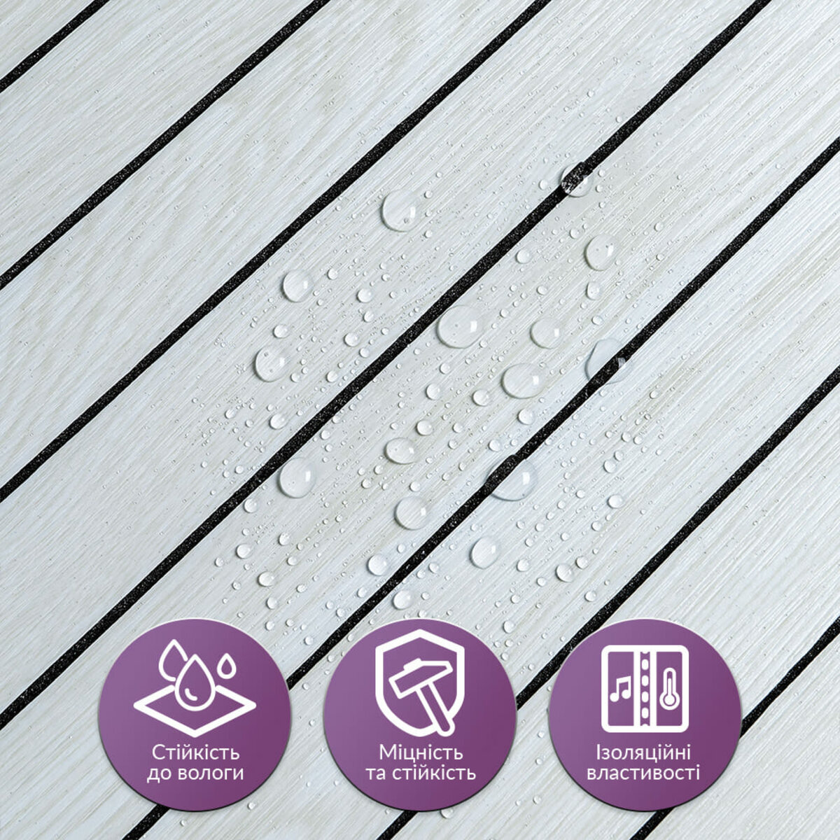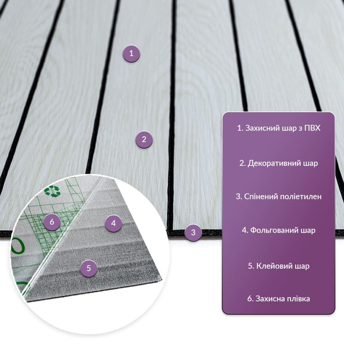 Захисний шар з ПВХ, захищає від потертостей та дрібних механічних пошкоджень, забезпечує довговічність використання, а УФ захист допомагає запобігти вигоранню, зберігаючи колір насиченим, за рахунок чого вінілова рейка довго має свій первісний естетичний вигляд.Також шар з ПВХ має стійкість до дії хімічних речовин, а за рахунок аморфності кристалічних ґрат ПВХ, дуже пружна, має малу вагу. Декоративний шар: плівка з кольоровим друком високої роздільної якості, яка повністю імітує фактуру природних матеріалів завдяки чіткому та деталізованому зображенню. Вспінений поліетилен (РЕ) - це полімерний матеріал із закритопористою структурою, легкий і гнучкий, має відмінні теплоізоляційні, звукоізоляційні та амортизаційні властивості, стійкий до вологи. Фольгований шар: основна властивість цього шару – відображення теплових хвиль, що дозволяє мінімізувати теплові втрати, тим самим покращити теплоізоляцію приміщення. Клейовий шар: нетоксична основа з високим рівнем адгезії.Захисна плівка – оберігає клейовий шар від пересихання та забруднення, легко знімається під час монтажу. Температурний режим: під впливом високих температур можуть деформуватися. У кухонній зоні поруч із джерелами вогню встановлення вінілової рейки необхідно проводити на відстані 30-50 см.