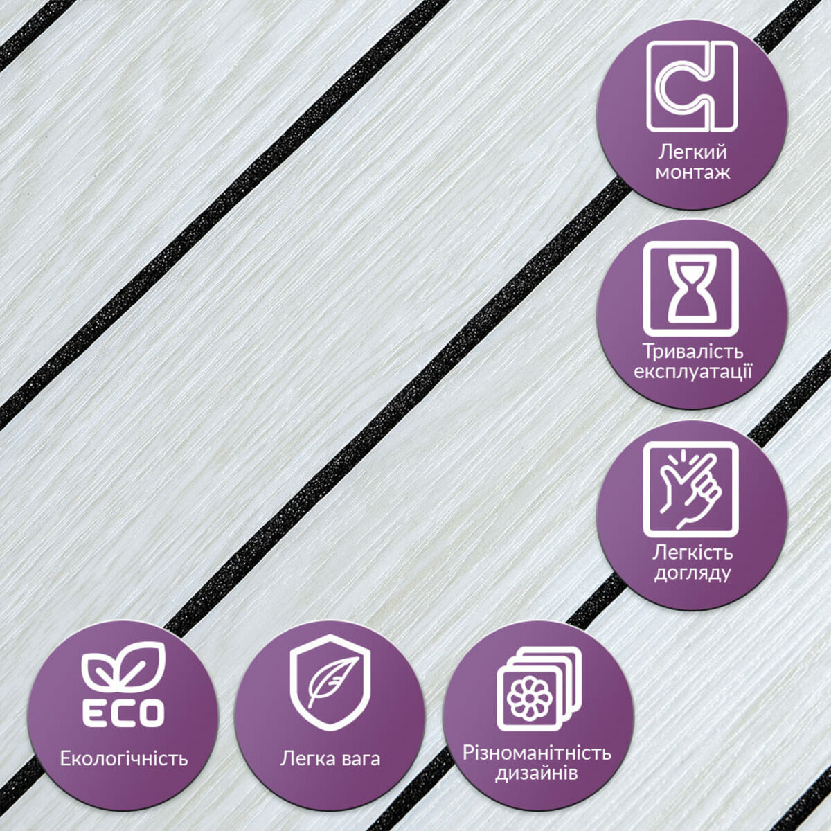 Легка установка: Завдяки клейовому шару монтаж вінілових рейок швидкий і простий, без потреби в додаткових матеріалах. Рейки легко ріжуться монтажним ножем або ножицями, укладаються стик у стик. Відсоток обрізу для настінних покриттів дуже низький. Стійкість до вологи: Вінілові рейки вологостійкі, що робить їх ідеальними для використання у вологих приміщеннях, таких як ванні кімнати та кухні. Вони не набухають і стійкі до пари та появи цвілі. Довговічність: Вінілові рейки зносостійкі, стійкі до механічних пошкоджень та подряпин, що забезпечує їх тривале використання в інтенсивно експлуатованих приміщеннях. Естетичні можливості: Широкий вибір текстур, кольорів і візерунків, що імітують натуральні матеріали. Це дозволяє підібрати рейки для будь-якого інтер'єру і створювати унікальні декоративні рішення. Також рейки можна монтувати в різних напрямках (горизонтально, вертикально або під кутом), що дає змогу реалізувати різні дизайнерські ідеї і створювати оригінальні візуальні ефекти. Легкий догляд: Вінілові рейки легко миються, не вимагають спеціальних засобів для очищення і не вбирають бруд. Ізоляційні властивості: Рейки мають відмінні тепло- і звукоізоляційні властивості, що робить їх придатними для приміщень, де важлива комфортна акустика і тепло. Екологічна безпека: Виготовляються з безпечних матеріалів, не виділяють шкідливих речовин і підлягають переробці, що робить їх екологічно чистими. Легка вага: Вінілові рейки мають малу вагу, що спрощує транспортування та монтаж. Вони ідеально підходять для використання в місцях, де потрібно мінімізувати навантаження на конструкцію, таких як тонкі перегородки або легкі стіни. Тонкий профіль з 3D-ефектом: Завдяки товщині 2,8 мм, рейки створюють привабливий 3D-ефект, не займаючи простір. Це робить їх ідеальними для використання в приміщеннях з обмеженим простором, таких як маленькі кімнати, коридори або офісні кабінети. Розрахунок потрібної кількості матеріалу: