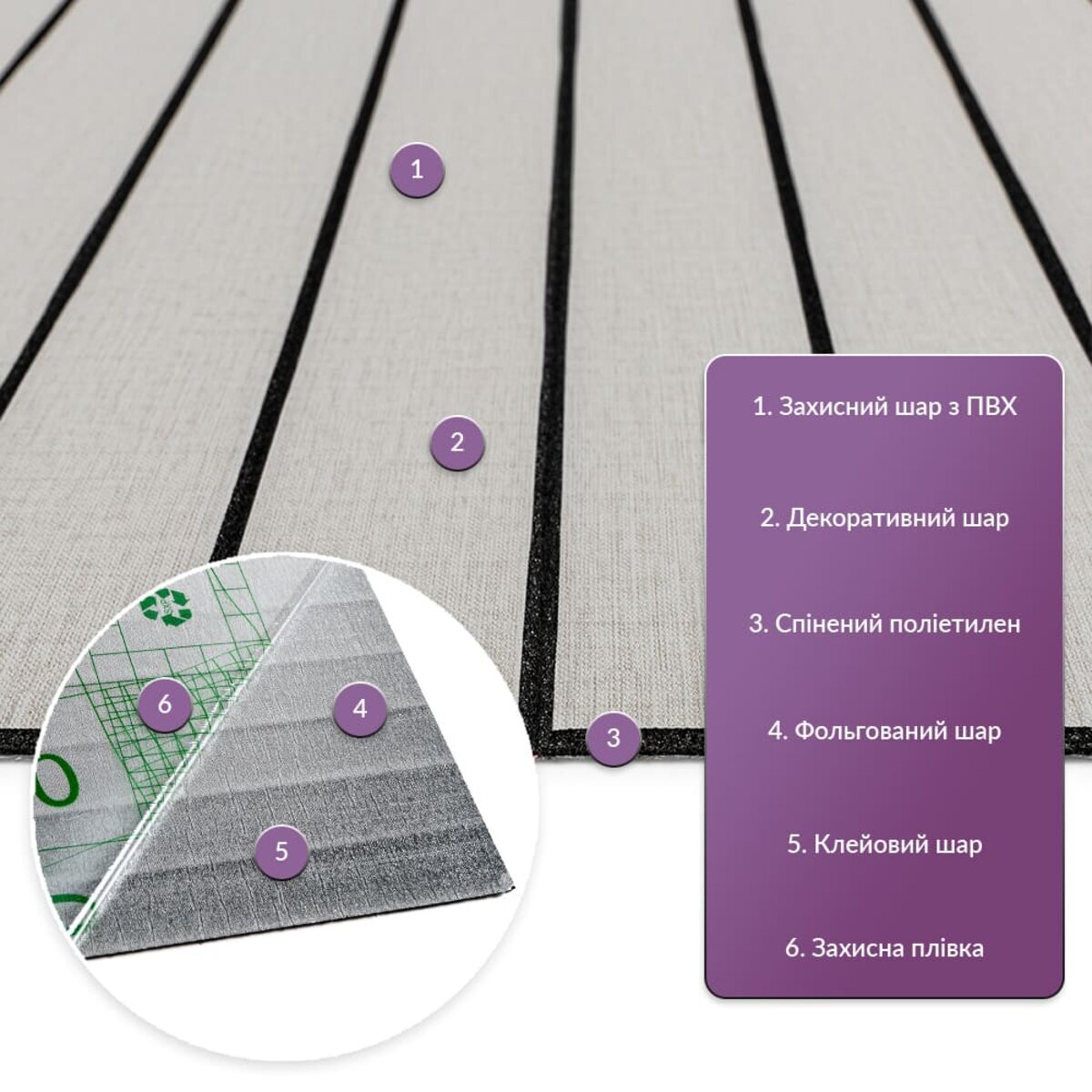 Захисний шар з ПВХ, захищає від потертостей та дрібних механічних пошкоджень, забезпечує довговічність використання, а УФ захист допомагає запобігти вигоранню, зберігаючи колір насиченим, за рахунок чого вінілова рейка довго має свій первісний естетичний вигляд.Також шар з ПВХ має стійкість до дії хімічних речовин, а за рахунок аморфності кристалічних ґрат ПВХ, дуже пружна, має малу вагу. Декоративний шар: плівка з кольоровим друком високої роздільної якості, яка повністю імітує фактуру природних матеріалів завдяки чіткому та деталізованому зображенню. Вспінений поліетилен (РЕ) - це полімерний матеріал із закритопористою структурою, легкий і гнучкий, має відмінні теплоізоляційні, звукоізоляційні та амортизаційні властивості, стійкий до вологи. Фольгований шар: основна властивість цього шару – відображення теплових хвиль, що дозволяє мінімізувати теплові втрати, тим самим покращити теплоізоляцію приміщення. Клейовий шар: нетоксична основа з високим рівнем адгезії.Захисна плівка – оберігає клейовий шар від пересихання та забруднення, легко знімається під час монтажу. Температурний режим: під впливом високих температур можуть деформуватися. У кухонній зоні поруч із джерелами вогню встановлення вінілової рейки необхідно проводити на відстані 30-50 см.