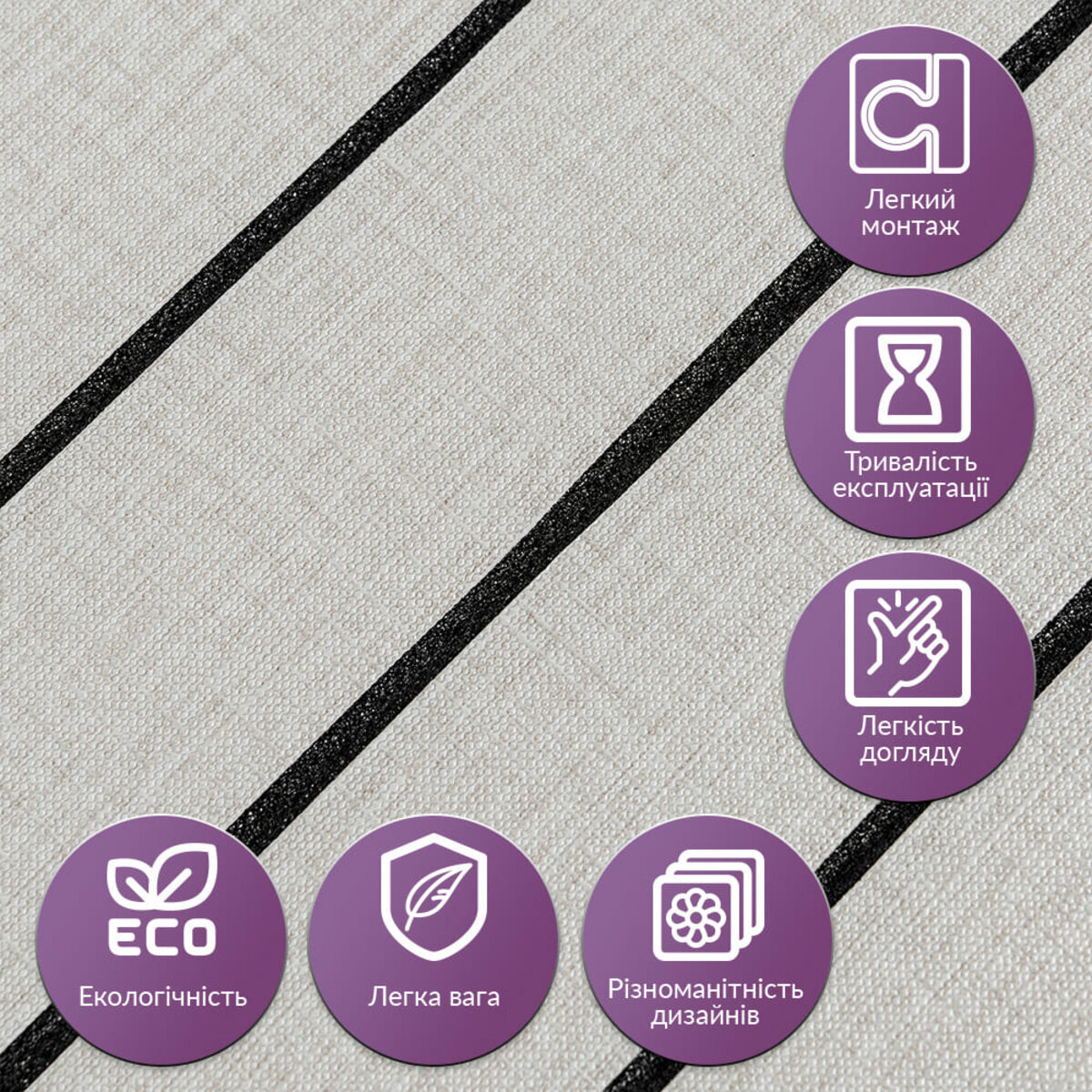 Легка установка: Завдяки клейовому шару монтаж вінілових рейок швидкий і простий, без потреби в додаткових матеріалах. Рейки легко ріжуться монтажним ножем або ножицями, укладаються стик у стик. Відсоток обрізу для настінних покриттів дуже низький. Стійкість до вологи: Вінілові рейки вологостійкі, що робить їх ідеальними для використання у вологих приміщеннях, таких як ванні кімнати та кухні. Вони не набухають і стійкі до пари та появи цвілі. Довговічність: Вінілові рейки зносостійкі, стійкі до механічних пошкоджень та подряпин, що забезпечує їх тривале використання в інтенсивно експлуатованих приміщеннях. Естетичні можливості: Широкий вибір текстур, кольорів і візерунків, що імітують натуральні матеріали. Це дозволяє підібрати рейки для будь-якого інтер'єру і створювати унікальні декоративні рішення. Також рейки можна монтувати в різних напрямках (горизонтально, вертикально або під кутом), що дає змогу реалізувати різні дизайнерські ідеї і створювати оригінальні візуальні ефекти. Легкий догляд: Вінілові рейки легко миються, не вимагають спеціальних засобів для очищення і не вбирають бруд. Ізоляційні властивості: Рейки мають відмінні тепло- і звукоізоляційні властивості, що робить їх придатними для приміщень, де важлива комфортна акустика і тепло. Екологічна безпека: Виготовляються з безпечних матеріалів, не виділяють шкідливих речовин і підлягають переробці, що робить їх екологічно чистими. Легка вага: Вінілові рейки мають малу вагу, що спрощує транспортування та монтаж. Вони ідеально підходять для використання в місцях, де потрібно мінімізувати навантаження на конструкцію, таких як тонкі перегородки або легкі стіни. Тонкий профіль з 3D-ефектом: Завдяки товщині 2,8 мм, рейки створюють привабливий 3D-ефект, не займаючи простір. Це робить їх ідеальними для використання в приміщеннях з обмеженим простором, таких як маленькі кімнати, коридори або офісні кабінети. Розрахунок потрібної кількості матеріалу: