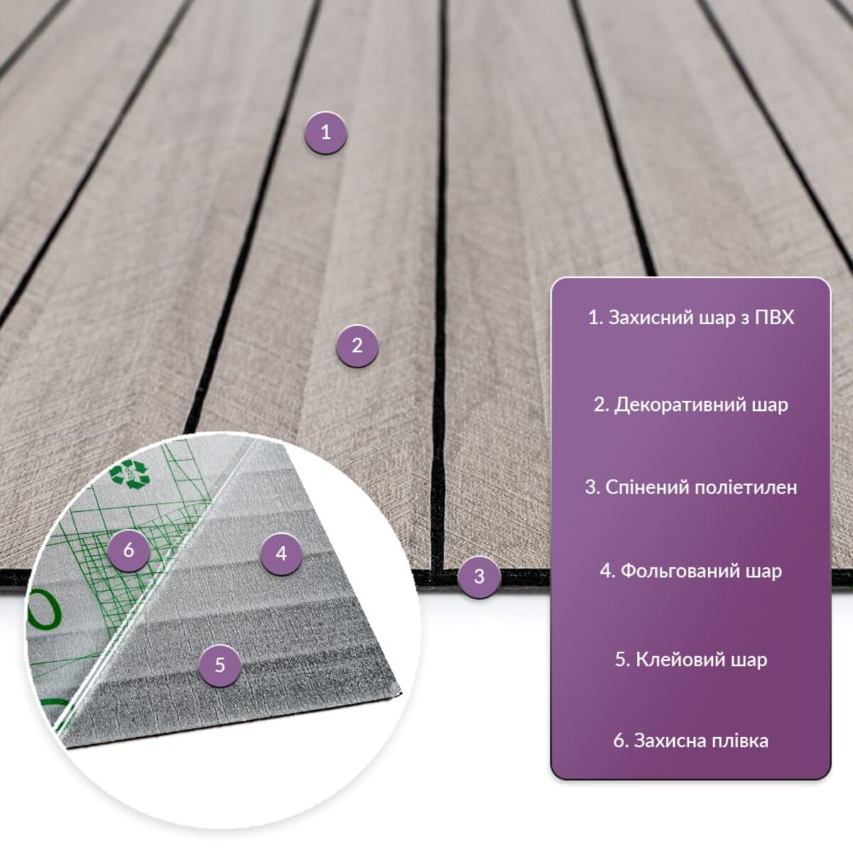 Захисний шар з ПВХ, захищає від потертостей та дрібних механічних пошкоджень, забезпечує довговічність використання, а УФ захист допомагає запобігти вигоранню, зберігаючи колір насиченим, за рахунок чого вінілова рейка довго має свій первісний естетичний вигляд.Також шар з ПВХ має стійкість до дії хімічних речовин, а за рахунок аморфності кристалічних ґрат ПВХ, дуже пружна, має малу вагу. Декоративний шар: плівка з кольоровим друком високої роздільної якості, яка повністю імітує фактуру природних матеріалів завдяки чіткому та деталізованому зображенню. Вспінений поліетилен (РЕ) - це полімерний матеріал із закритопористою структурою, легкий і гнучкий, має відмінні теплоізоляційні, звукоізоляційні та амортизаційні властивості, стійкий до вологи. Фольгований шар: основна властивість цього шару – відображення теплових хвиль, що дозволяє мінімізувати теплові втрати, тим самим покращити теплоізоляцію приміщення. Клейовий шар: нетоксична основа з високим рівнем адгезії.Захисна плівка – оберігає клейовий шар від пересихання та забруднення, легко знімається під час монтажу. Температурний режим: під впливом високих температур можуть деформуватися. У кухонній зоні поруч із джерелами вогню встановлення вінілової рейки необхідно проводити на відстані 30-50 см.