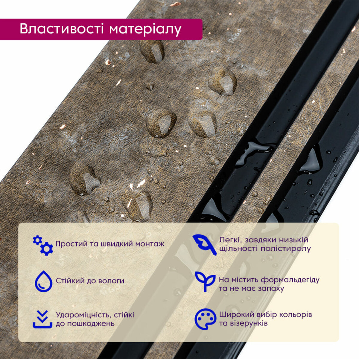 - Безпека: Матеріали не містять формальдегіду і не мають запаху.