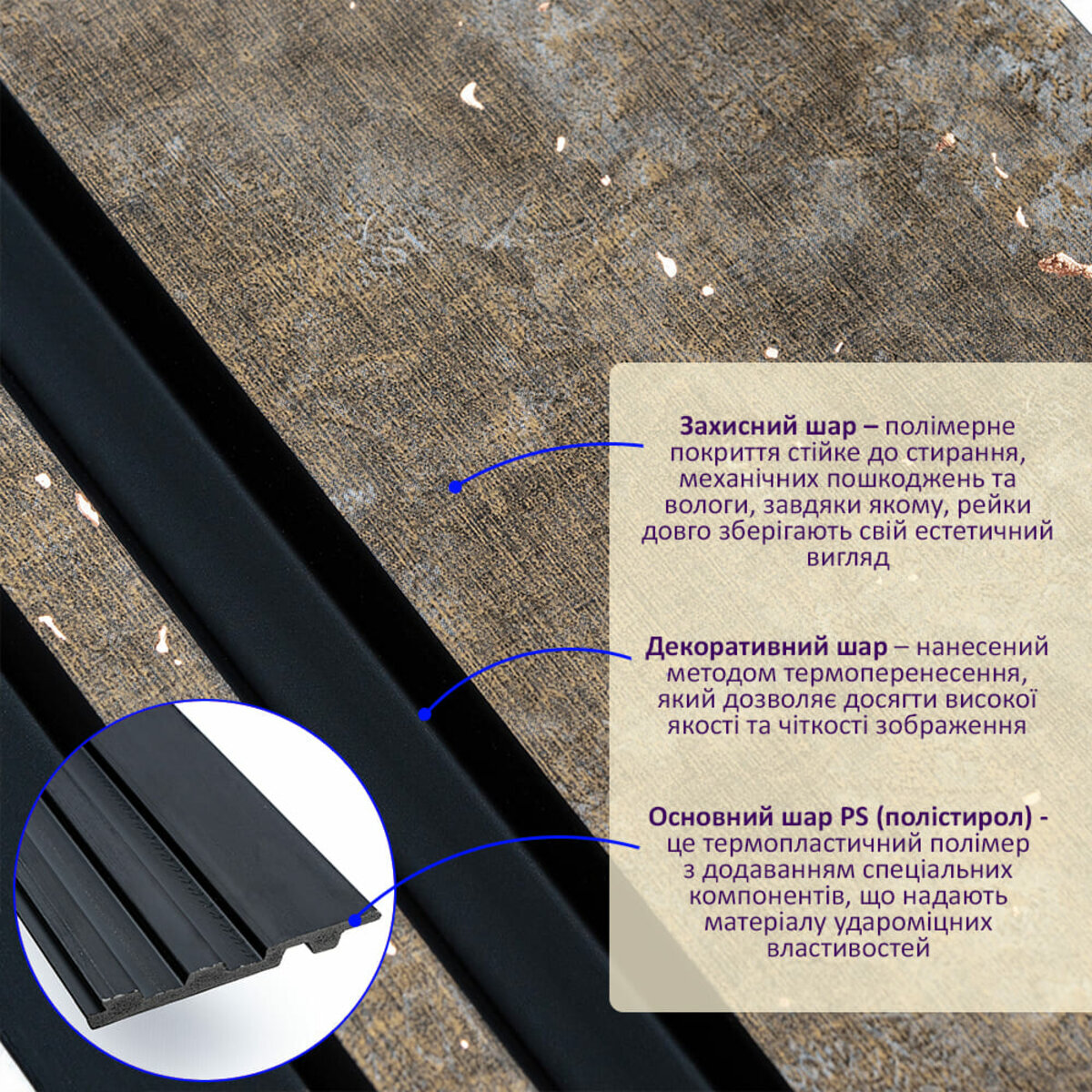 - Захисний шар – полімерне покриття стійке до стирання, механічних пошкоджень та вологи, завдяки якому, рейки довго зберігають свій естетичний вигляд.