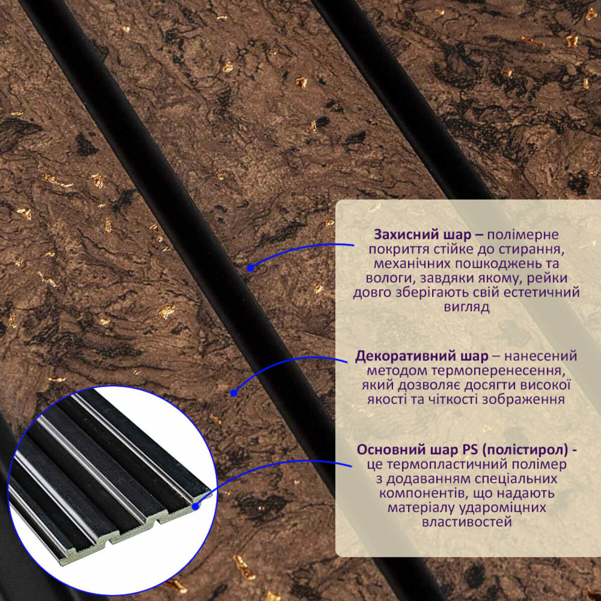 - Захисний шар – полімерне покриття стійке до стирання, механічних пошкоджень та вологи, завдяки якому, рейки довго зберігають свій естетичний вигляд.