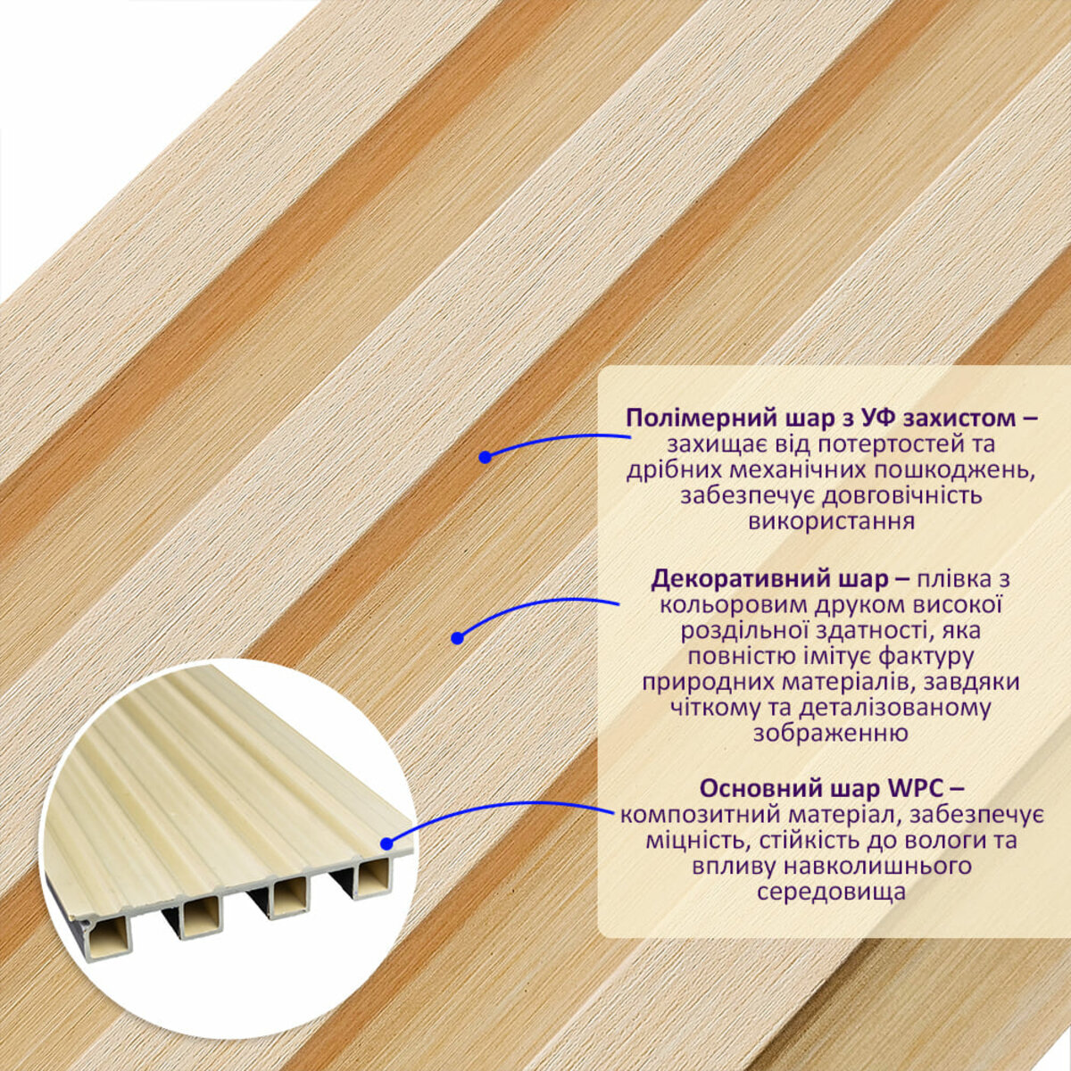Полімерний шар, що захищає від потертостей та дрібних механічних пошкоджень, забезпечує довговічність використання, а УФ захист допомагає запобігти вигоранню, зберігаючи колір декоративного шару насиченим, за рахунок чого рейка довго має свій первісний естетичний вигляд. Декоративний шар: плівка з кольоровим друком високої роздільної здатності, яка повністю імітує фактуру природних матеріалів, завдяки чіткому та деталізованому зображенню. Основний шар WPC: є композитним матеріалом, який поєднує в собі деревні волокна (або стружку) з полімерними матеріалами, що забезпечує матеріалу міцність, стійкість до вологи і стійкість до впливу зовнішнього середовища. Температурний режим: від -50 º до +80 º С