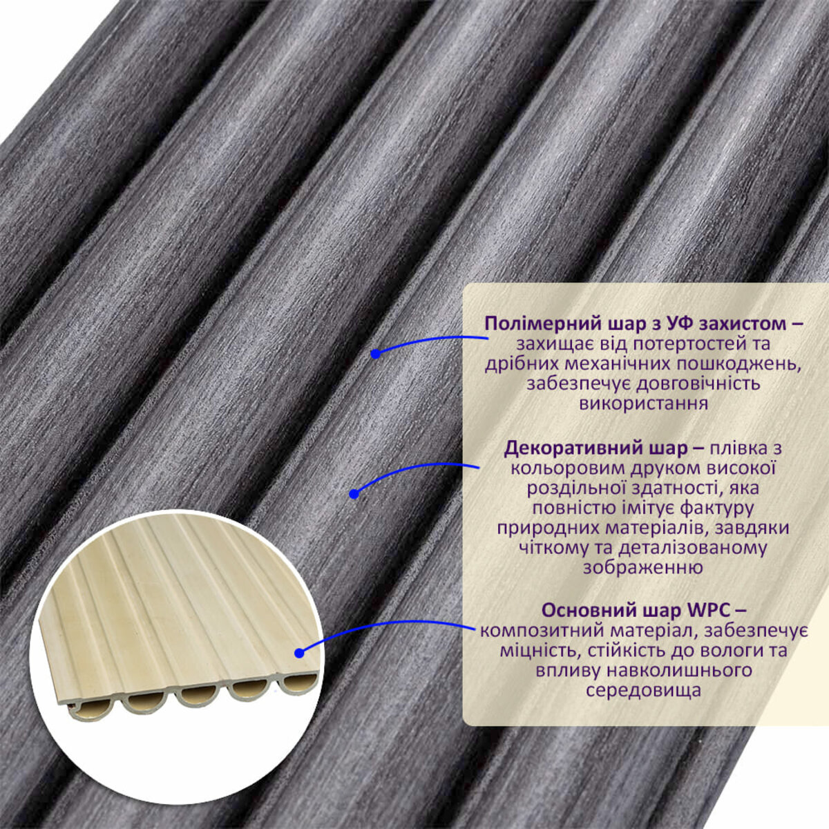 Полімерний шар, що захищає від потертостей та дрібних механічних пошкоджень, забезпечує довговічність використання, а УФ захист допомагає запобігти вигоранню, зберігаючи колір декоративного шару насиченим, за рахунок чого рейка довго має свій первісний естетичний вигляд. Декоративний шар: плівка з кольоровим друком високої роздільної здатності, яка повністю імітує фактуру природних матеріалів, завдяки чіткому та деталізованому зображенню. Основний шар WPC: є композитним матеріалом, який поєднує в собі деревні волокна (або стружку) з полімерними матеріалами, що забезпечує матеріалу міцність, стійкість до вологи і стійкість до впливу зовнішнього середовища. Температурний режим: від -50 º до +80 º С