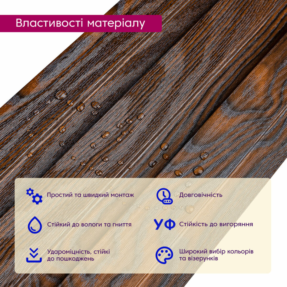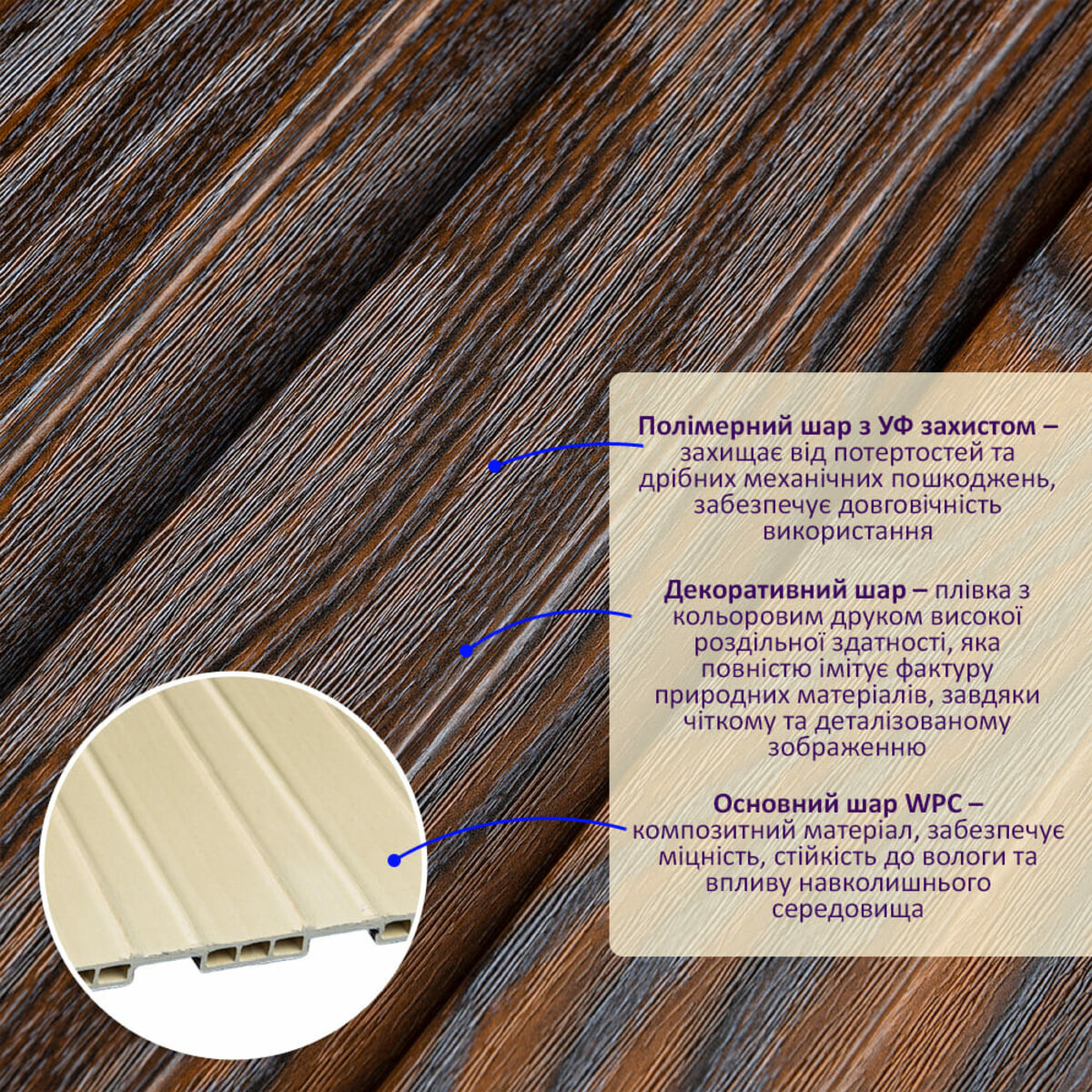 Полімерний шар, що захищає від потертостей та дрібних механічних пошкоджень, забезпечує довговічність використання, а УФ захист допомагає запобігти вигоранню, зберігаючи колір декоративного шару насиченим, за рахунок чого рейка довго має свій первісний естетичний вигляд. Декоративний шар: плівка з кольоровим друком високої роздільної здатності, яка повністю імітує фактуру природних матеріалів, завдяки чіткому та деталізованому зображенню. Основний шар WPC: є композитним матеріалом, який поєднує в собі деревні волокна (або стружку) з полімерними матеріалами, що забезпечує матеріалу міцність, стійкість до вологи і стійкість до впливу зовнішнього середовища. Температурний режим: від -50 º до +80 º С