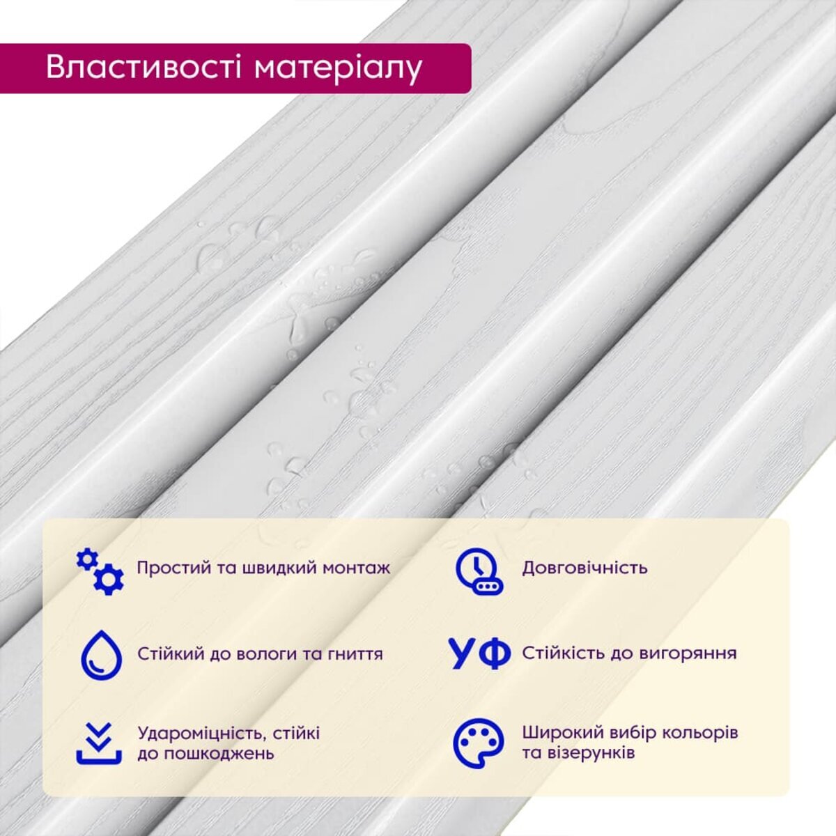 Полімерний шар, що захищає від потертостей та дрібних механічних пошкоджень, забезпечує довговічність використання, а УФ захист допомагає запобігти вигоранню, зберігаючи колір декоративного шару насиченим, за рахунок чого рейка довго має свій первісний естетичний вигляд. Декоративний шар: плівка з кольоровим друком високої роздільної здатності, яка повністю імітує фактуру природних матеріалів, завдяки чіткому та деталізованому зображенню. Основний шар WPC: є композитним матеріалом, який поєднує в собі деревні волокна (або стружку) з полімерними матеріалами, що забезпечує матеріалу міцність, стійкість до вологи і стійкість до впливу зовнішнього середовища. Температурний режим: від -50 º до +80 º С