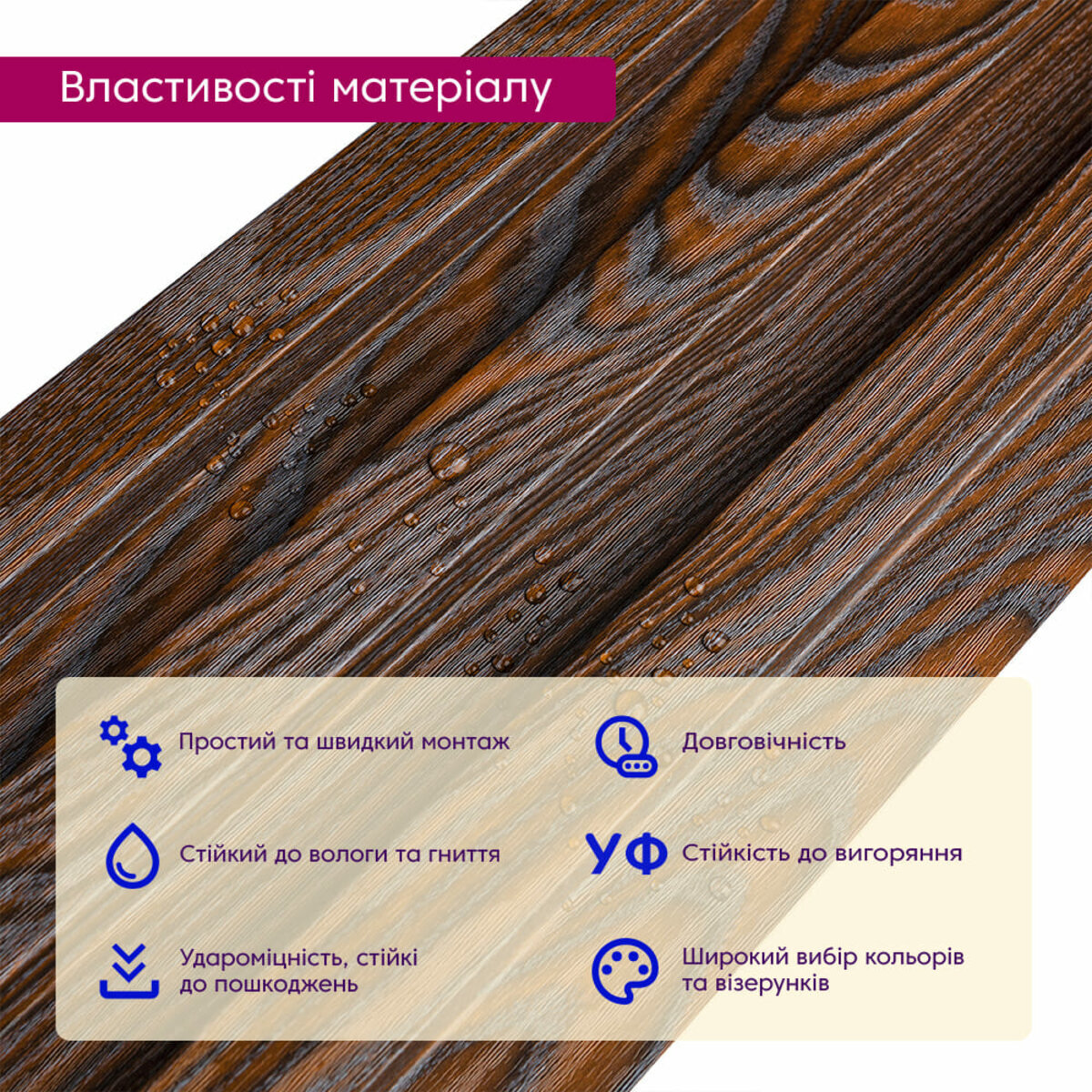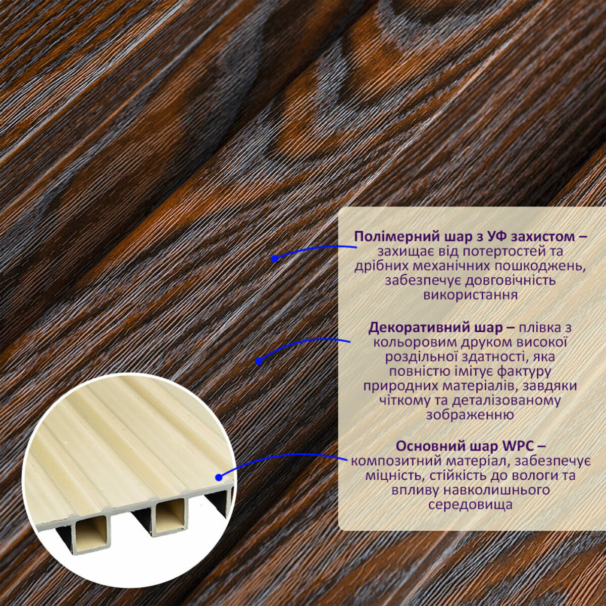 Полімерний шар, що захищає від потертостей та дрібних механічних пошкоджень, забезпечує довговічність використання, а УФ захист допомагає запобігти вигоранню, зберігаючи колір декоративного шару насиченим, за рахунок чого рейка довго має свій первісний естетичний вигляд. Декоративний шар: плівка з кольоровим друком високої роздільної здатності, яка повністю імітує фактуру природних матеріалів, завдяки чіткому та деталізованому зображенню. Основний шар WPC: є композитним матеріалом, який поєднує в собі деревні волокна (або стружку) з полімерними матеріалами, що забезпечує матеріалу міцність, стійкість до вологи і стійкість до впливу зовнішнього середовища. Температурний режим: від -50 º до +80 º С
