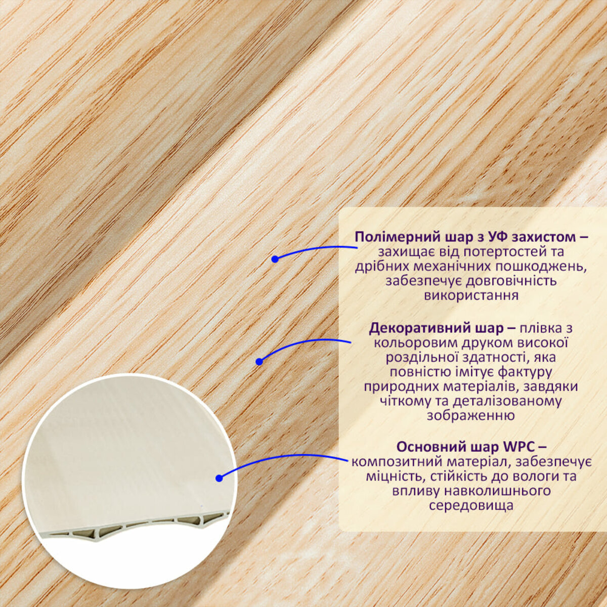 Полімерний шар, що захищає від потертостей та дрібних механічних пошкоджень, забезпечує довговічність використання, а УФ захист допомагає запобігти вигоранню, зберігаючи колір декоративного шару насиченим, за рахунок чого рейка довго має свій первісний естетичний вигляд. Декоративний шар: плівка з кольоровим друком високої роздільної здатності, яка повністю імітує фактуру природних матеріалів, завдяки чіткому та деталізованому зображенню. Основний шар WPC: є композитним матеріалом, який поєднує в собі деревні волокна (або стружку) з полімерними матеріалами, що забезпечує матеріалу міцність, стійкість до вологи і стійкість до впливу зовнішнього середовища. Температурний режим: від -50 º до +80 º С